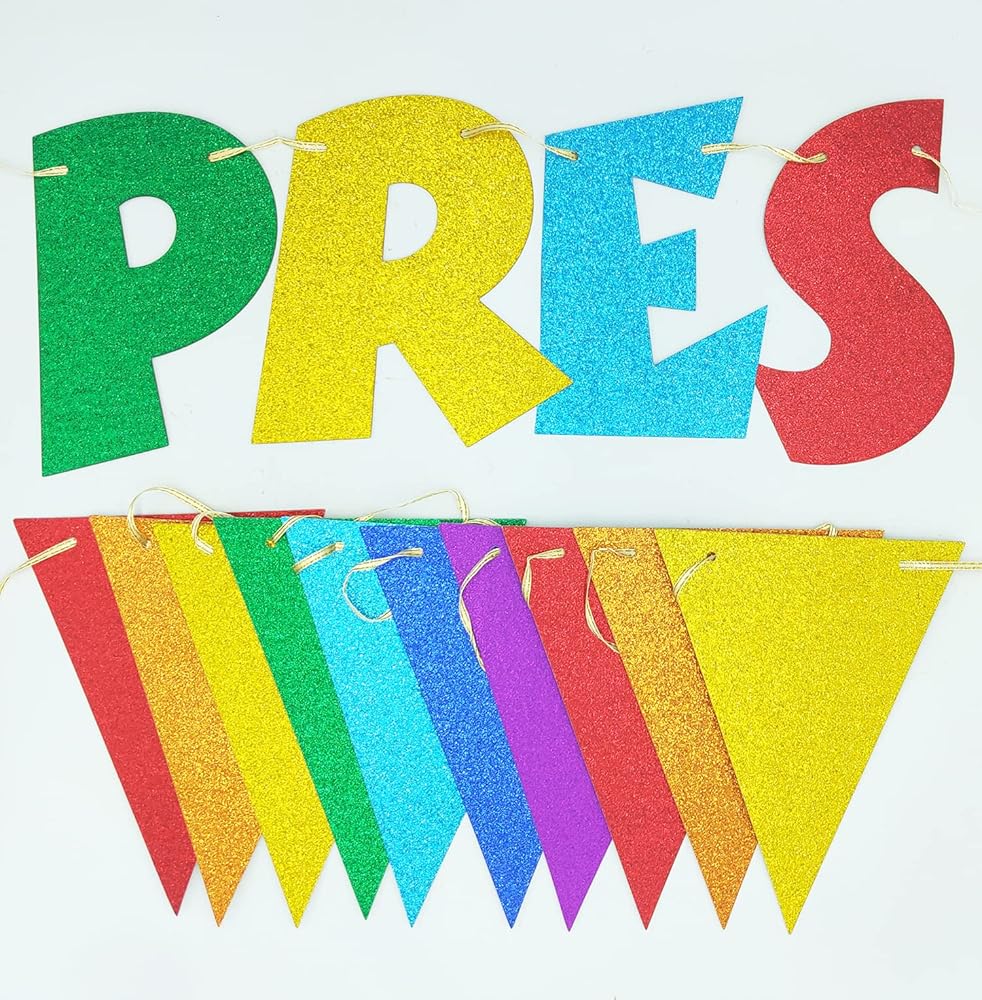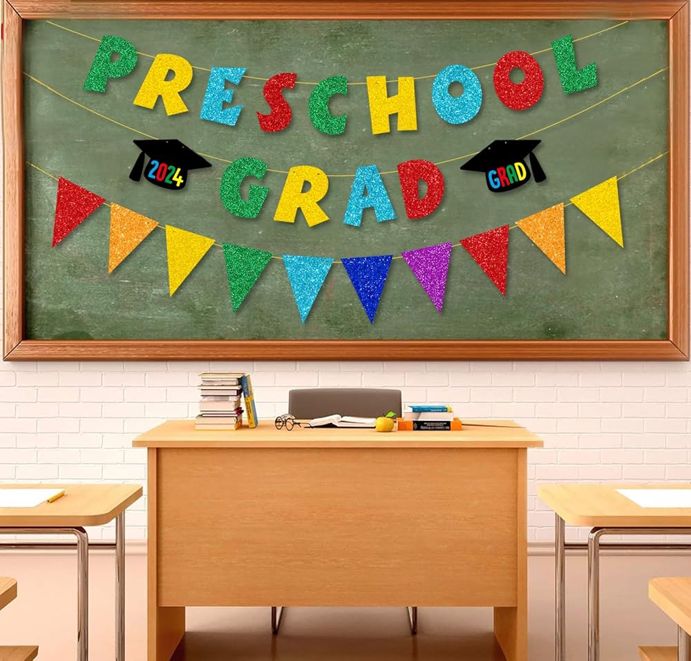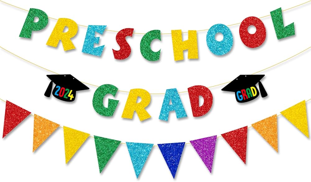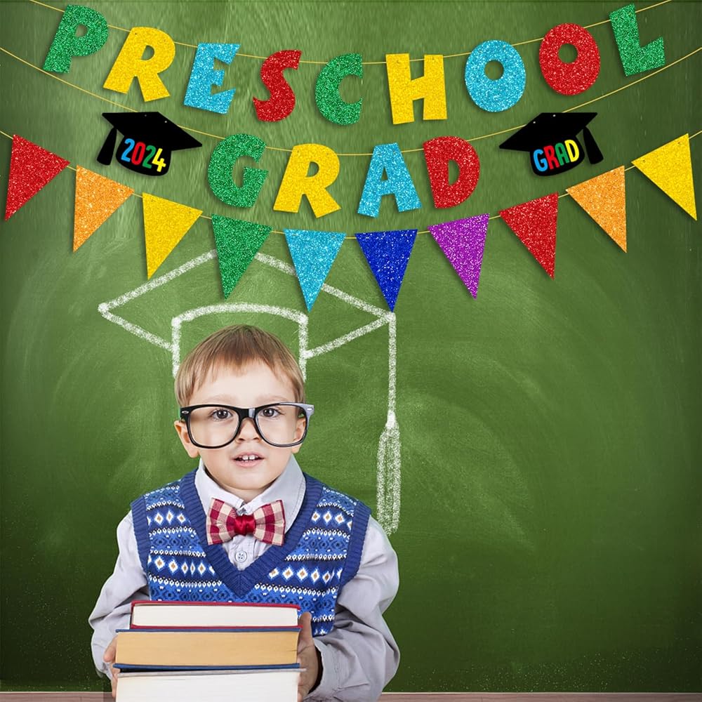Wanting to have a cute 2022 preschool graduation party decorations? Glittery preschool grad banner with graduation cap signs and glittery pennant banner, a great banner set for school or home 2022 kids preschool graduation party decorations or kindergarten pre k congrats grad party decors, create cute atmosphere on your preschool grad party. The class of 2022 preschool graduate banner and pennant garland are beautifully crafted on a sturdy glitter paper. A perfect 2022 preschool graduation decorations banner purposely crafted for school or home preschool grad party. Features: - Colorful glittery card material, beautiful and durable. - Each letter length approx is 5.5 inch / 14 cm. Graduation cap length approx is 8.3 inch / 21 cm. Each pennant is 6.7 inch / 17 cm. The glittery preschool grad banner and glitter pennant garland are long enough (3 meters / 9.8 feet) - Colorful glittery "PRESCHOOL GRAD" words with graduation cap signs, and glittery pennant banner - “PRESCHOOL GRAD" banner and glittery pennant banner come pre-assembled, no DIY needed of buyer. Many Uses: - Preschool grad part, kindergarten pre-k graduation party, school kids preschool themed party and other any occasions. - Great Preschool congrats grad decorations to use on the school, living room, yard, garden, ceiling, in a doorway, window, and any other place, and used as photo booth backdrop EASY TO USE The preschool grad garland banner comes ready to hang, No DIY required, very convenient for you to hang on. You can adjust the gap between the flags freely, and the rope is long enough (3 meters / 9.8 feet long) for hanging it any where you want. Package Includes 1 x Colorful Glittery PRESCHOOL Banner (Come Pre-strung) 1 x Colorful Glittery GRAD Banner with 2022 Grad Graduation Cap Signs (Come Pre-strung) 1 x Colorful Glittery Pennant Garland Banner (Come Pre-strung)