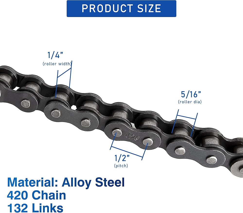 · 【Specifications】Chain No.: 420; Pitch: 1/2"; Roller Width: 1/4"; Roller Diameter: 5/16"; Sprocket Thickness: 0.227". Breaker is good for 420-530.Chain total length 59" in 132 links