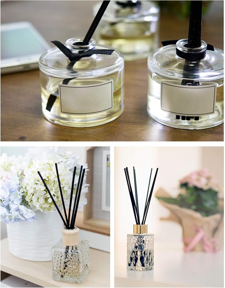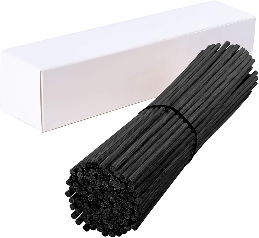 المواد: عصا قصب الألياف. الكمية: 120 قطعة من أعواد القصب الليفية (لون أسود) مع صندوق تخزين. الحجم: الطول 10 بوصة والقطر 4 ملم. إنها ذات حجم جيد لوضعها في زجاجات الروائح، وهي مثالية كديكور أيضًا.