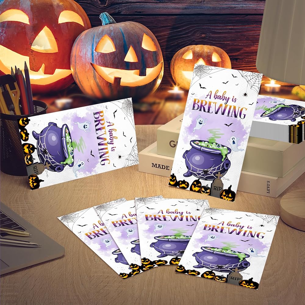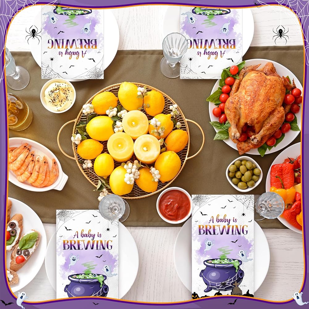 تصميم كلاسيكي: تتميز مناديل استحمام الأطفال الخاصة بالهالوين باللون الأرجواني الكلاسيكي وتطبع عليها رسالة "A baby is Brewing"، بالإضافة إلى أنماط مثل القرع والأشباح، مما يجعلها القطعة المركزية المثالية لحفلة الكشف عن جنسك.