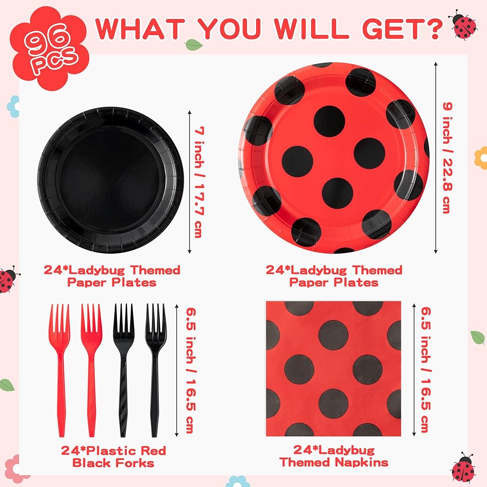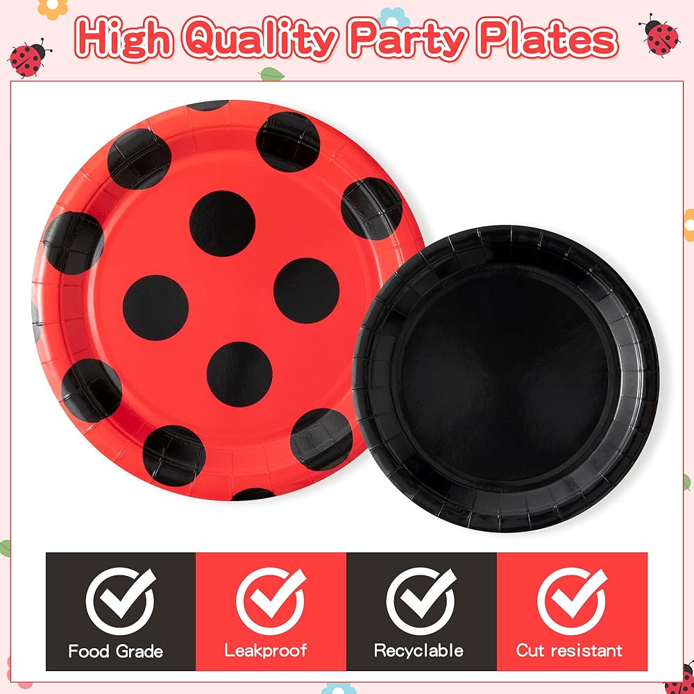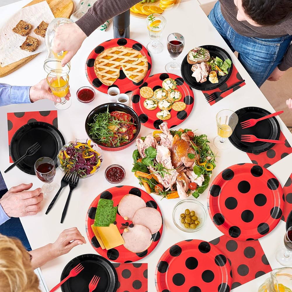 خدمة 24 ضيفًا: سوف تحصل على 24 طبقًا ورقيًا على شكل خنفساء مقاس 9 بوصات، و24 طبقًا ورقيًا أسود مقاس 7 بوصات، و24 منديلًا على شكل خنفساء و24 شوكة بلاستيكية باللون الأسود والأحمر، مما يجعل من السهل خدمة مجموعة من 24 ضيفًا.