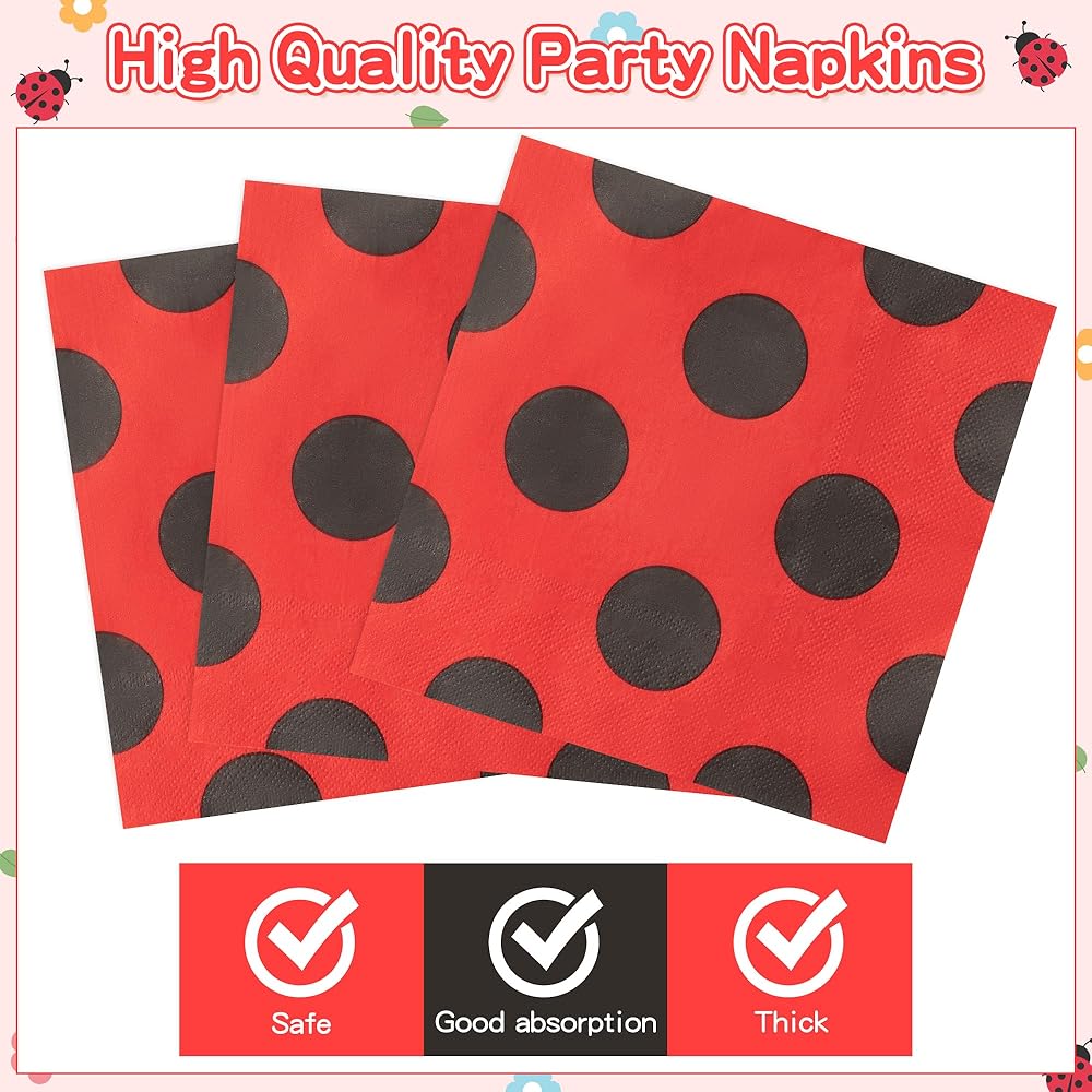 مجموعة حفلات LADYBUG: تم تصميم مجموعة أدوات مائدة حفلات Ladybug بطباعة منقطة باللونين الأحمر والأسود. أضف لمسة من السحر والغرابة إلى حفلتك، ومليئة بأجواء مرحة ولطيفة.
