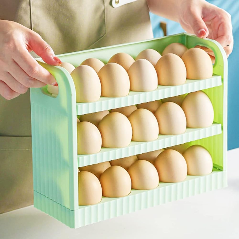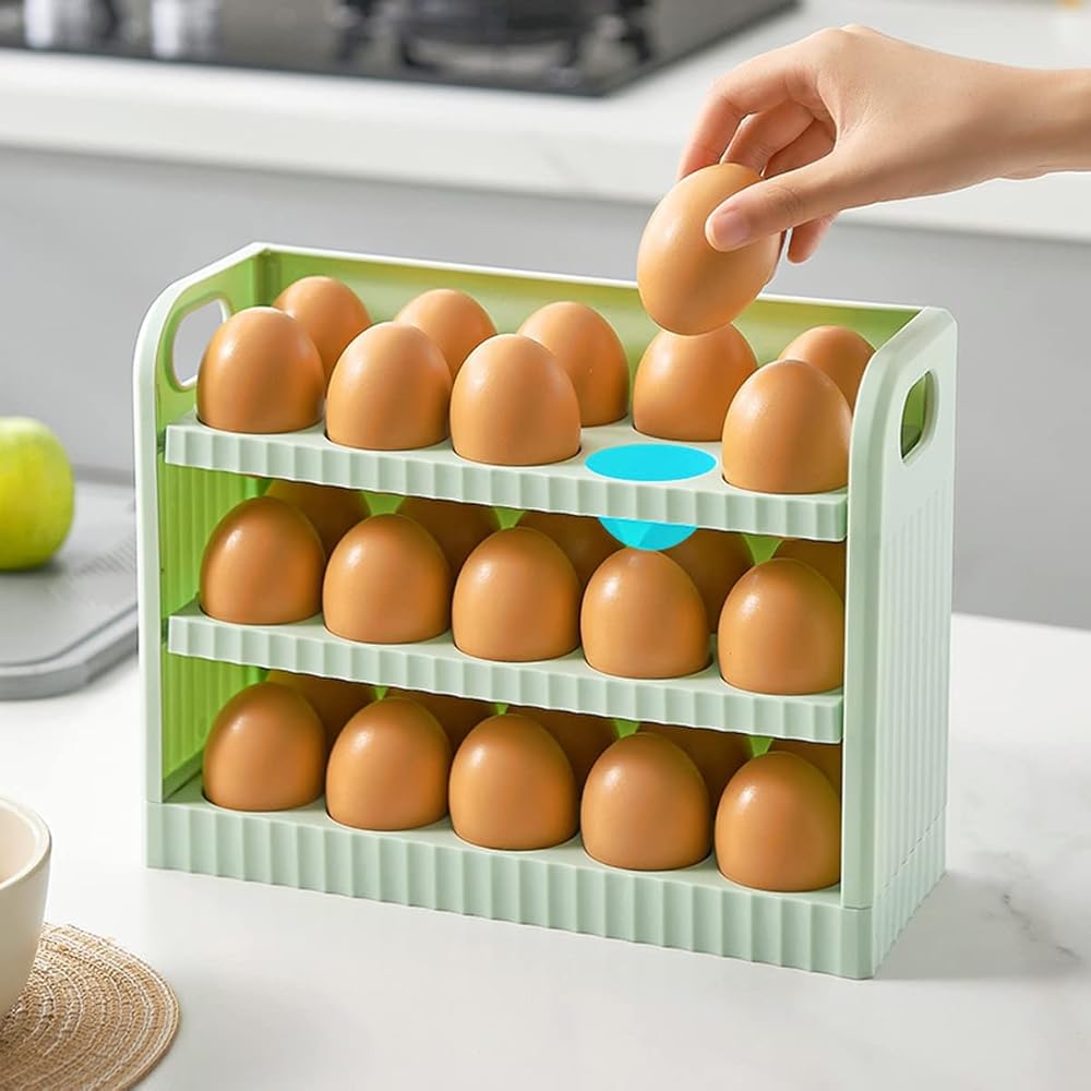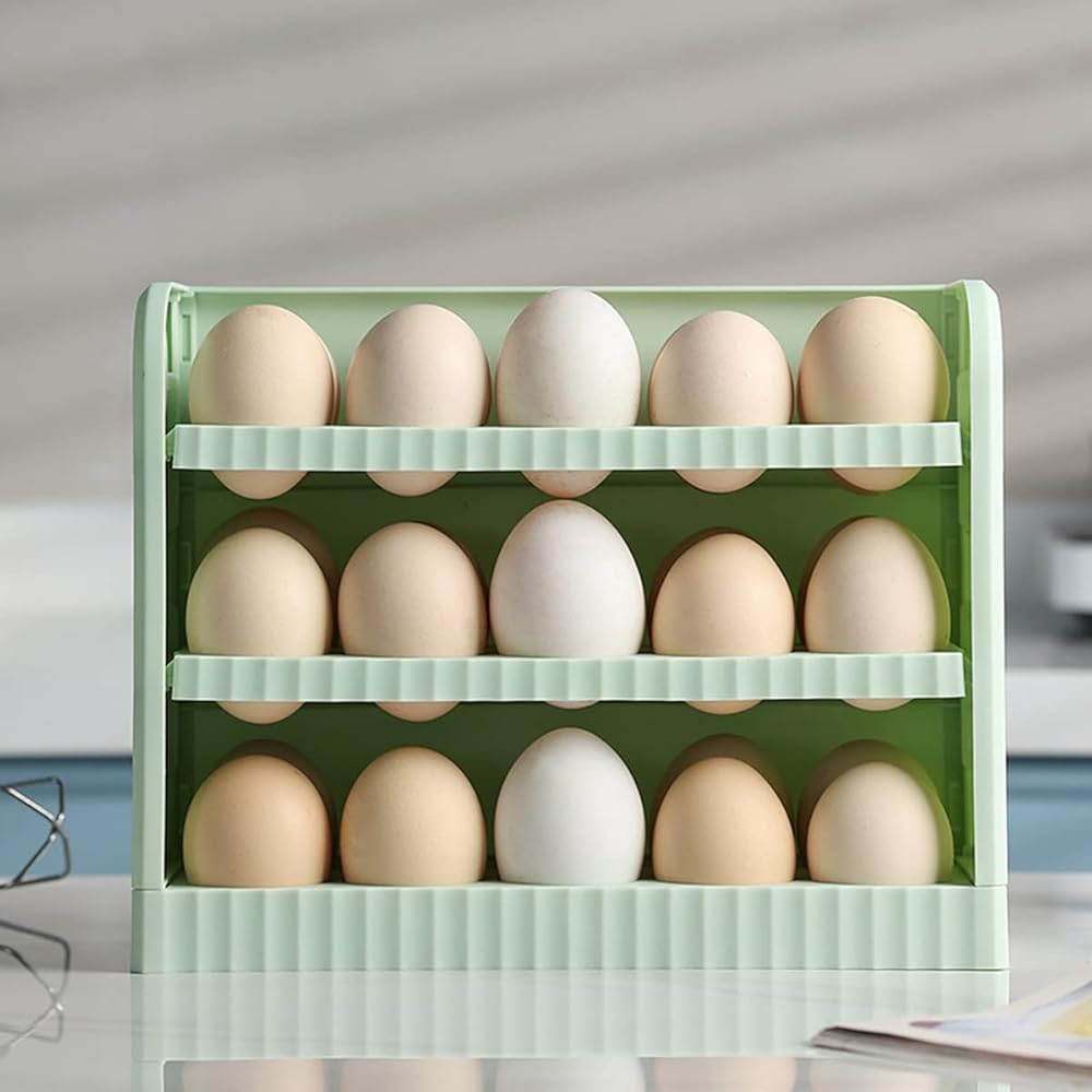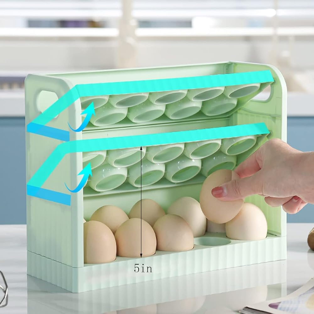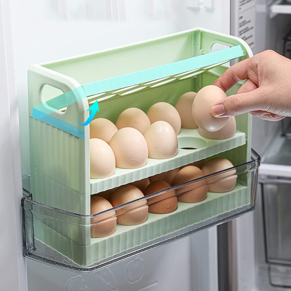 3 Layers Flip Design Egg Holder,Each egg is placed separately and stably. Groove deign effectively prevent the egg from colliding and breaking. Innovation semi-enclosed design,provide convenience for your life, and provides good ventilation keep the eggs fresh.