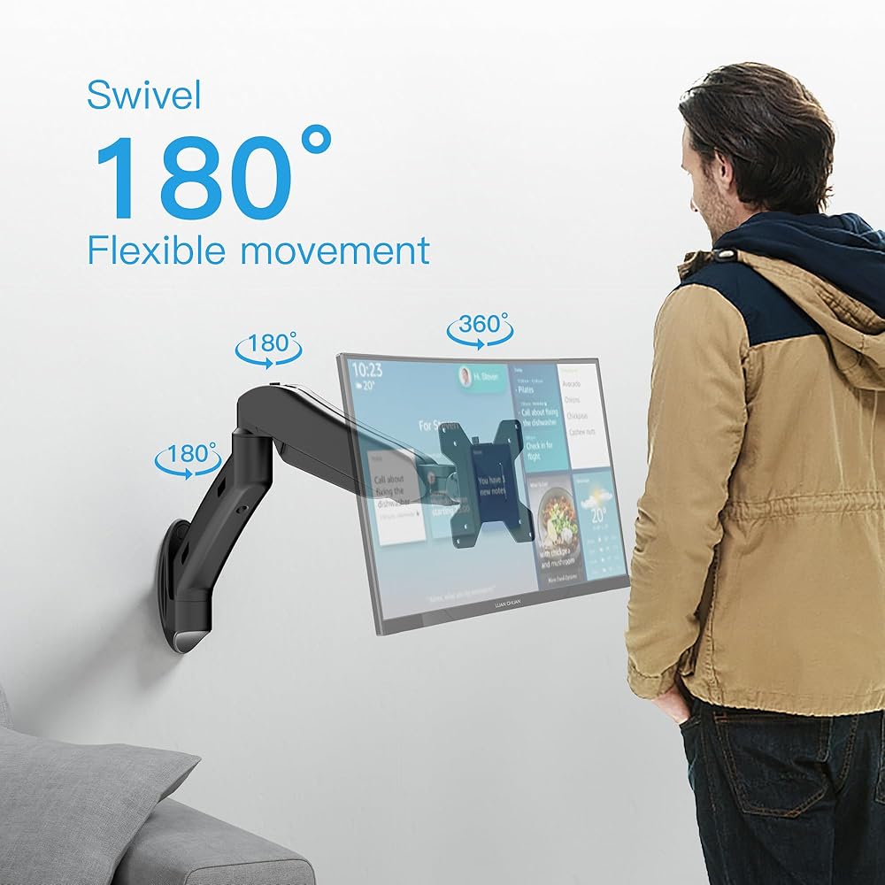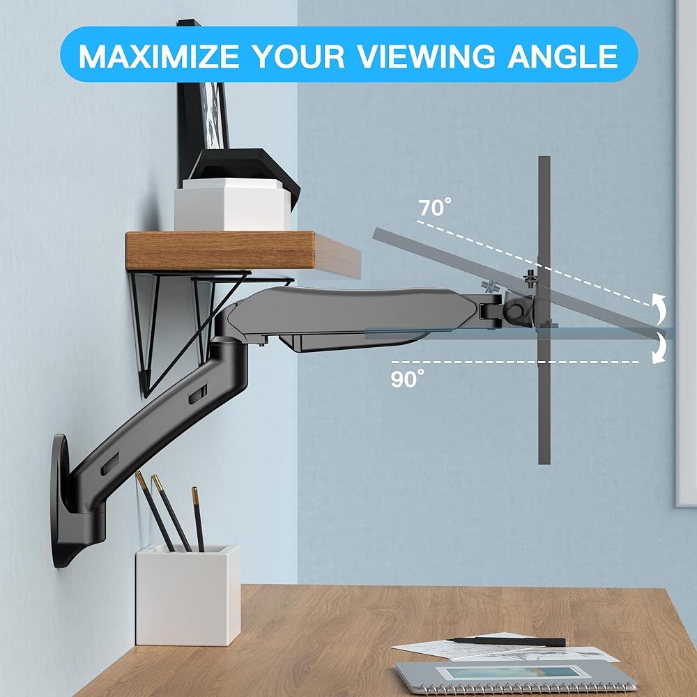 FULL MOTION TV MOUNT:With this single wall monitor mount, your new device can be swivel from side to side,up to 180 degree. Regardless your viewing height,the gas spring adjustable monitor arm can tilt up 70°and down 90°.