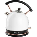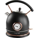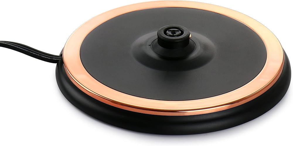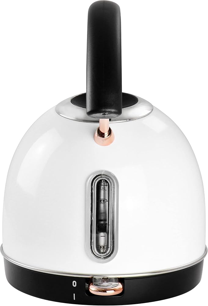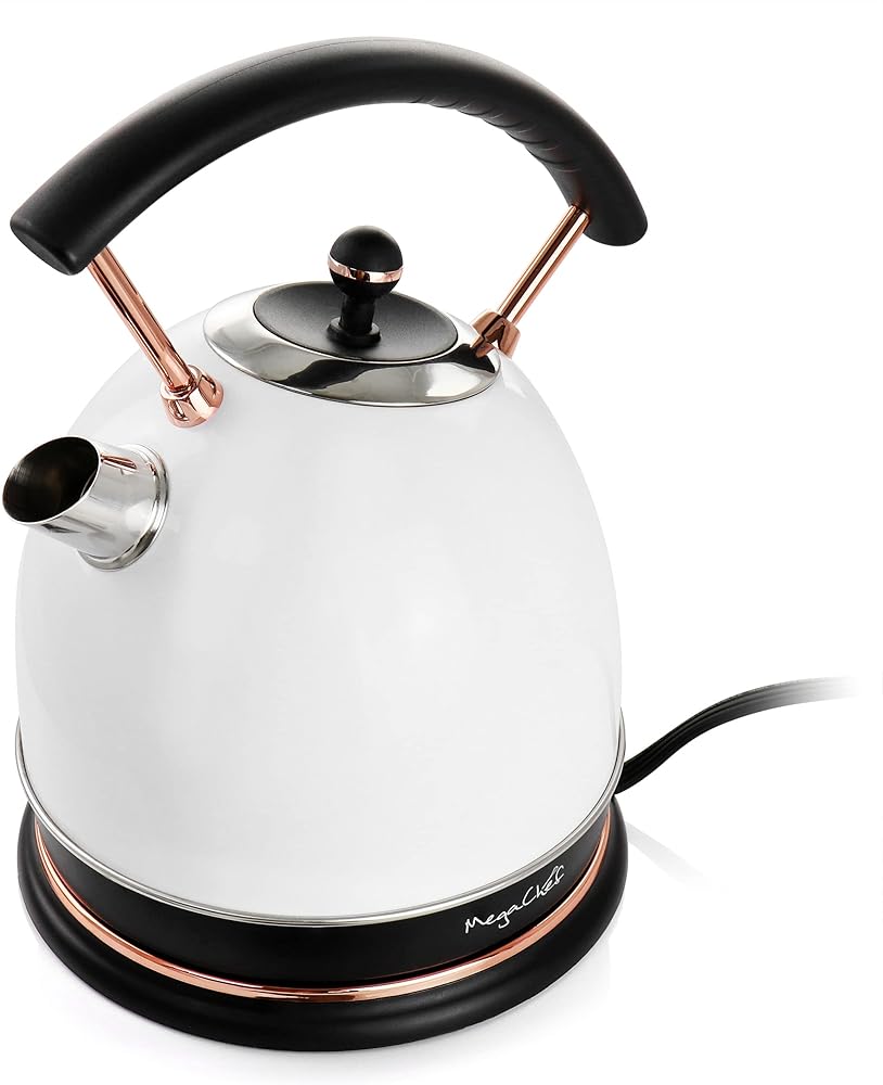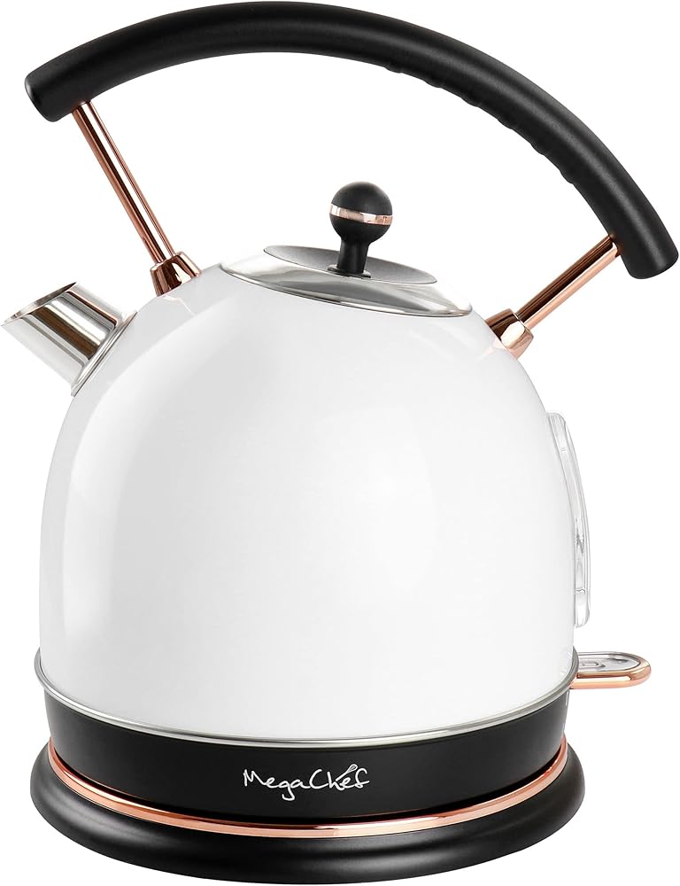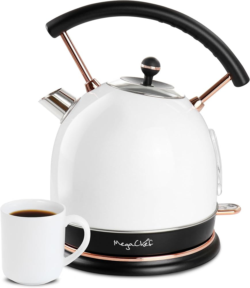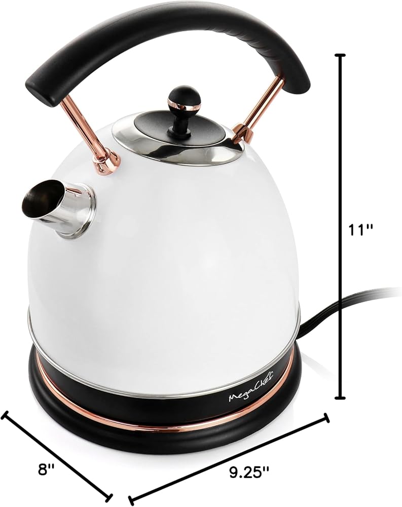 Add a touch of Style and fashion with the MegaChef 1.8 Liter Half Circle Electric Tea kettle in Matte Black with Rose Gold finish. This MegaChef 1.8 Liter Electric Kettle adds a flair of retro style to your kitchen decor. Constructed of premium stainless steel body, spout and removable filter. The 1500 Watts of power rapidly boils water for coffees, teas, cocoas, snacks, soups and much more! Water indicator window lets you see exactly how much to fill and how much hot water you have left for serving. . Features boil dry protection, drip free spout and cordless serving. Cord Storage conveniently keeps cord out of sight and your counts clutter free.