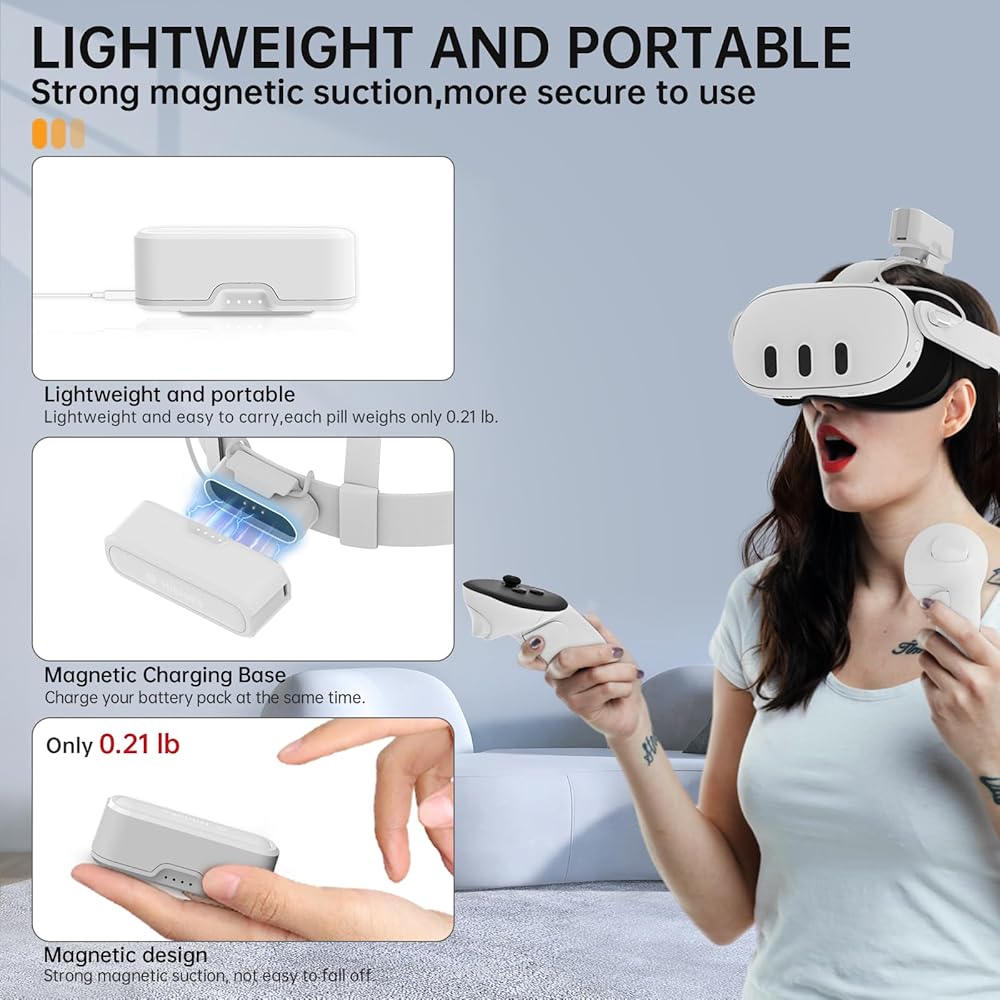 • 【خفيفة الوزن وقابلة للحمل】تزن حزمة بطارية Quest 3 99 جرامًا فقط (3.4 أونصة) وهي خفيفة الوزن للغاية، مما يسمح لك بالاستمتاع بجلسات لعب طويلة