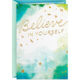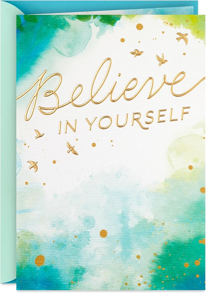 Front of card features a blue and green watercolor design with gold "Believe in yourself" lettering