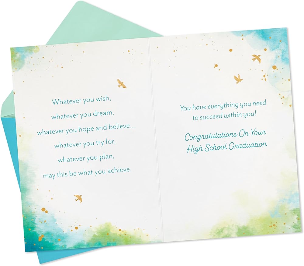 Let your friends and family know you're celebrating their latest achievement with a festive graduation card. With a watercolor design and supportive message inside, it's a sophisticated accompaniment to any high school graduation gift. There's nothing like a handwritten note to commemorate starting a new chapter in life, and this card is a great way to express your excitement or pride. The Hallmark brand is widely recognized as the very best for cards, gift wrap, and more. For more than 100 years, Hallmark has been helping its customers make everyday moments more beautiful and celebrations more joyful.