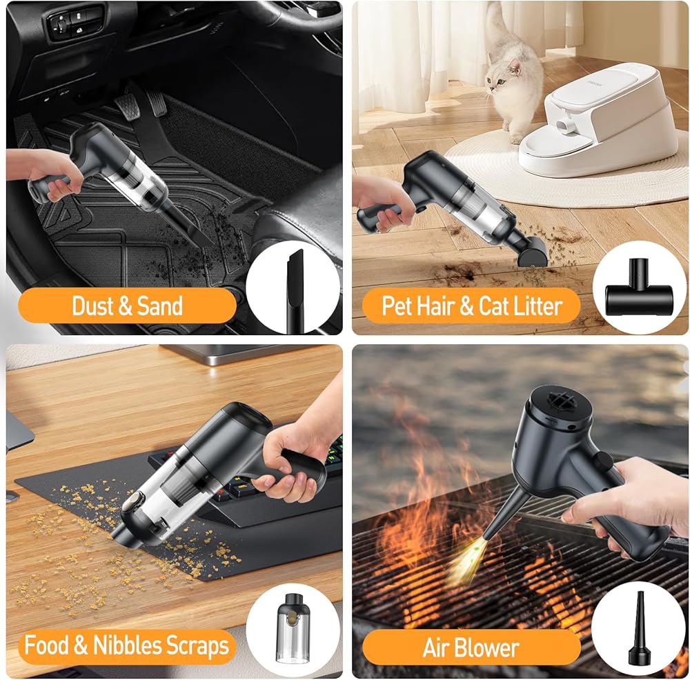 وظيفة الشفط والنفخ: هذه المكنسة الكهربائية المحمولة لا تمتص الغبار فحسب، بل تقوم أيضًا بنفخ الغبار، أحد طرفي وصلة الملحقات هو تأثير التنظيف بالمكنسة الكهربائية، والطرف الآخر هو وظيفة النفخ، ويمكن استخدامها كمنفضة هواء. تتميز المكنسة الكهربائية اللاسلكية المحمولة باليد بتصميم ذكي، مما يمنحك تجربة تنظيف فعالة.