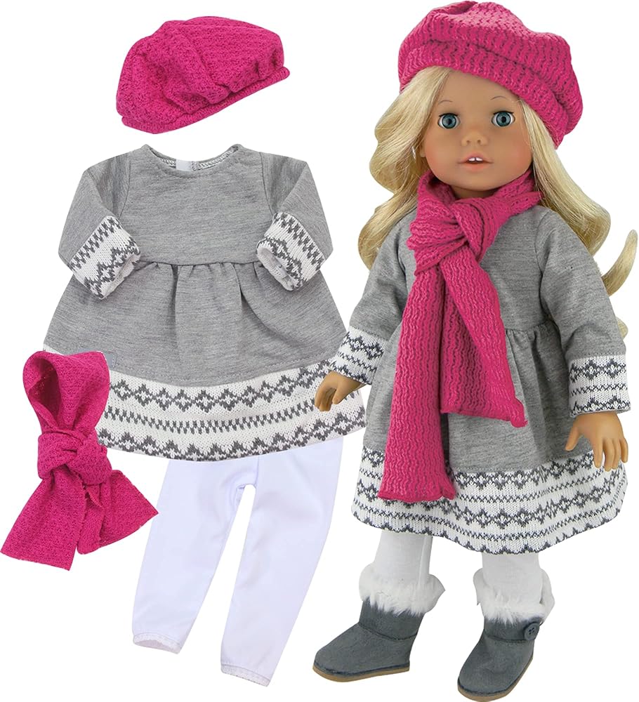 المجموعة الشتوية: تشتمل هذه المجموعة المكونة من 4 قطع على فستان بنمط جزيرة Fair Isle رمادي/أبيض، وبنطلون ضيق أبيض، وقبعة على طراز بيريه وردي فاقع ووشاح مطابق