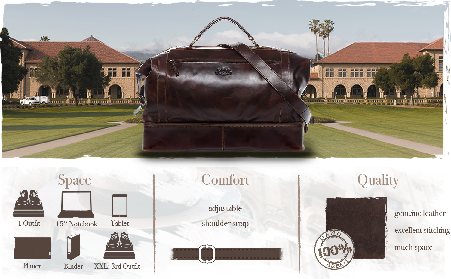مصنوع يدويًا بالكامل: سوف يرافقك عطلة نهاية الأسبوع العصرية لسنوات عديدة. حجمها وبساطتها الأنيقة يجعلها مثالية لممارسة الرياضة والرحلات القصيرة إلى جميع أنحاء العالم.