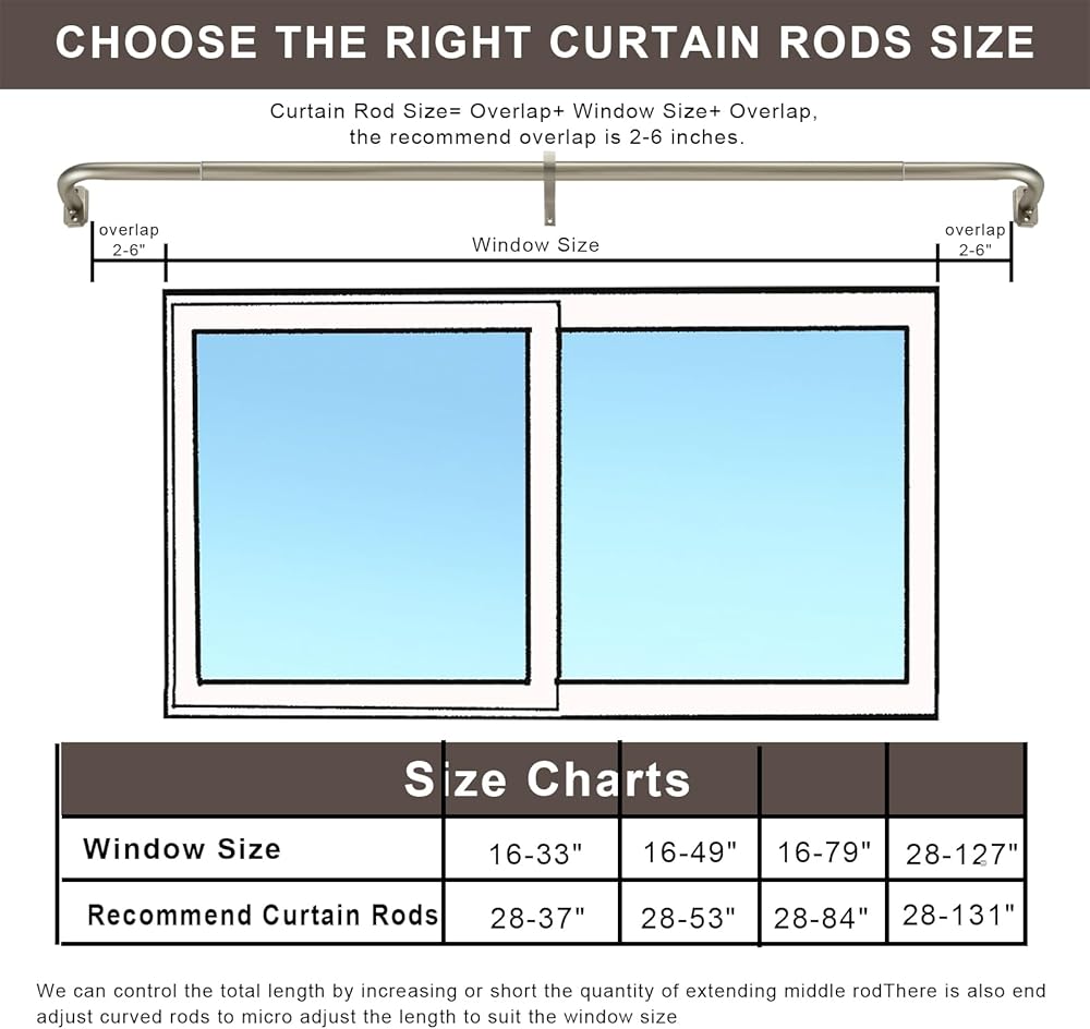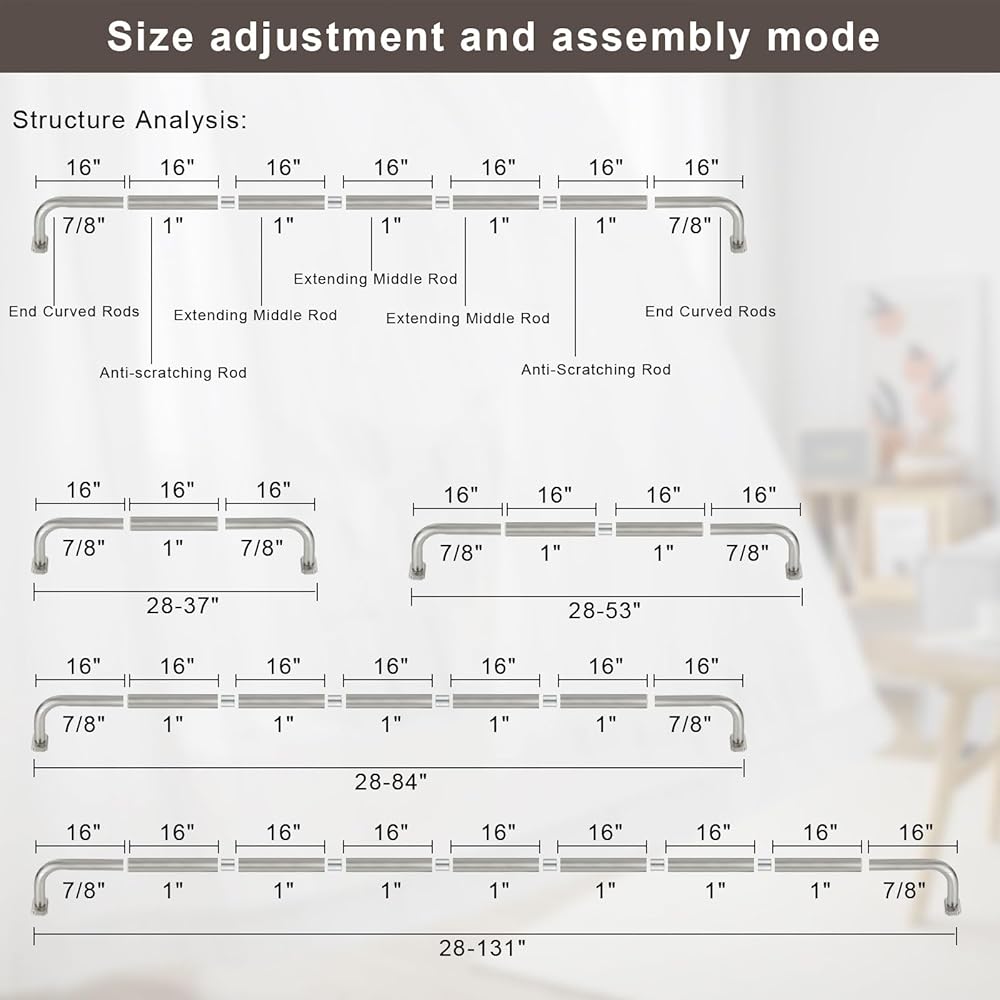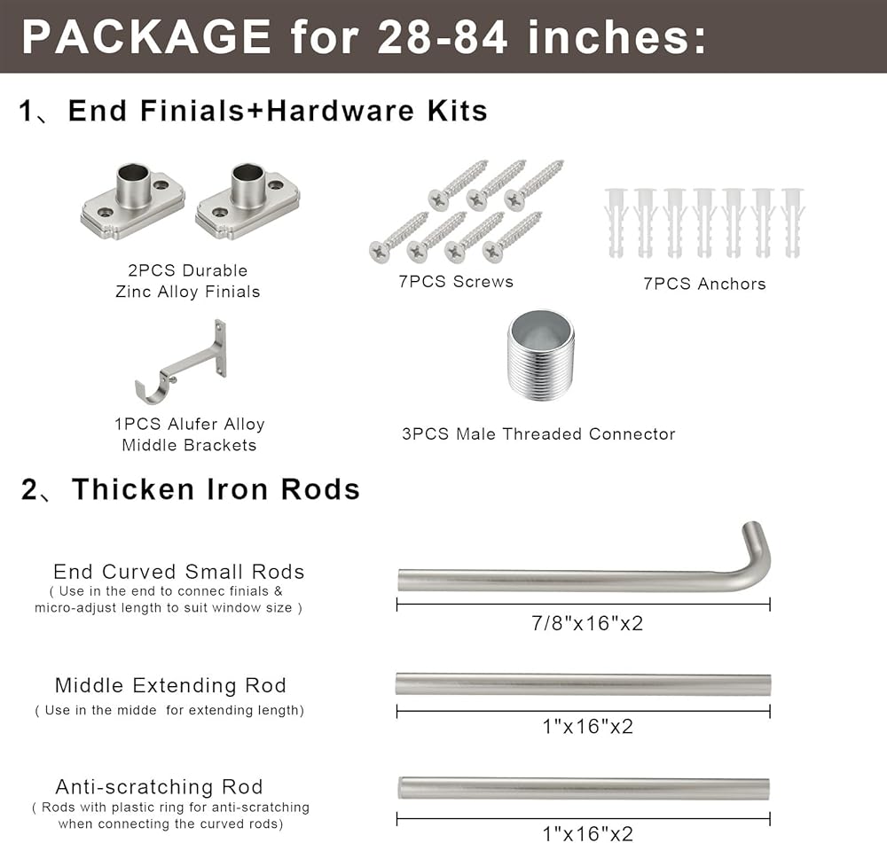 قضبان نوافذ قابلة للتعديل: يمكن تعديل قضبان ستائر الربط لتناسب عروض النوافذ المختلفة، مما يسمح لك بإطالة أو تقصير القضيب بسهولة لتحقيق العرض المطلوب. القضبان الطرفية منحنية بشكل تلسكوبي لضبطها لتناسب حجم النافذة والوسط يبلغ قطرها 2.54 سم وقضبان تثبيت بطول 40.64 سم، فقط قم بربطها معًا بالكميات التي تحتاجها، وقضبان ربط الستائر لها نفس الحجم في المنتصف مما يجعلها أكثر سلاسة في انزلاق الستائر.