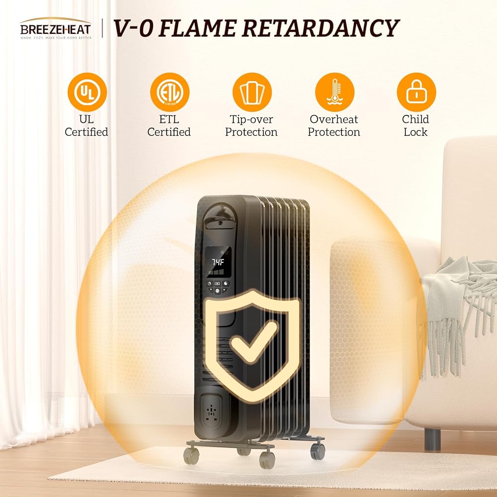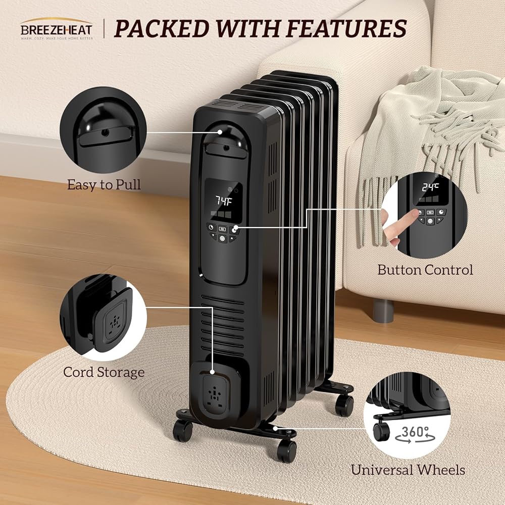سخان كهربائي مملوء بالزيت بقدرة 1500 واط من BREEZEHEAT مع منظم حرارة قابل للتعديل، 4 أوضاع، حماية من الحرارة الزائدة والحرارة الزائدة، شاشة رقمية، سخانات محمولة للاستخدام المكتبي/الداخلي
