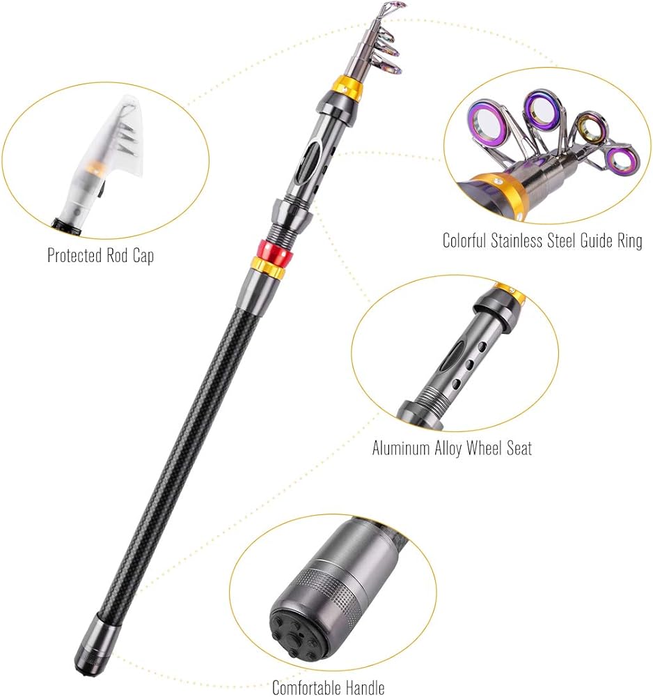 🎣[قضيب صيد تلسكوبي] صنارة الصيد التليسكوبية الخاصة بنا مصنوعة من ألياف الكربون عالية الكثافة، وهي متينة وخفيفة الوزن وسهلة الحمل! 📢نصائح: لا تستخدم صنارة السمك لسحب السمكة إلى الشاطئ مباشرةً. خلاف ذلك، سيتم إتلاف قضيب السمك بسهولة. الطريقة الصحيحة لأخذ السمكة إلى الشاطئ هي استعادة خط الصيد وسحب السمكة بالقرب من الماء. استخدام الشبكة لصيد السمك!