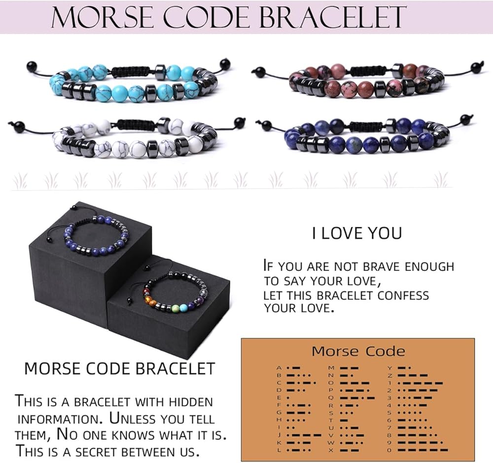 【أساور كود مورس للنساء】-- يستخدم رمز مورس النقاط والخطوط للتعبير عن الكلمات وتم استخدامه لأول مرة في الاتصالات التلغرافية والبحرية. هذا الرمز الفريد معروف لك وللمستلم فقط. يا لها من طريقة خاصة لمفاجأة شخص مميز. يعد استخدام شفرة مورس لسوار فكرة رائعة جدًا. هذا سوار رائع لتخبر الناس برأيك دون أن تقول كلمة واحدة