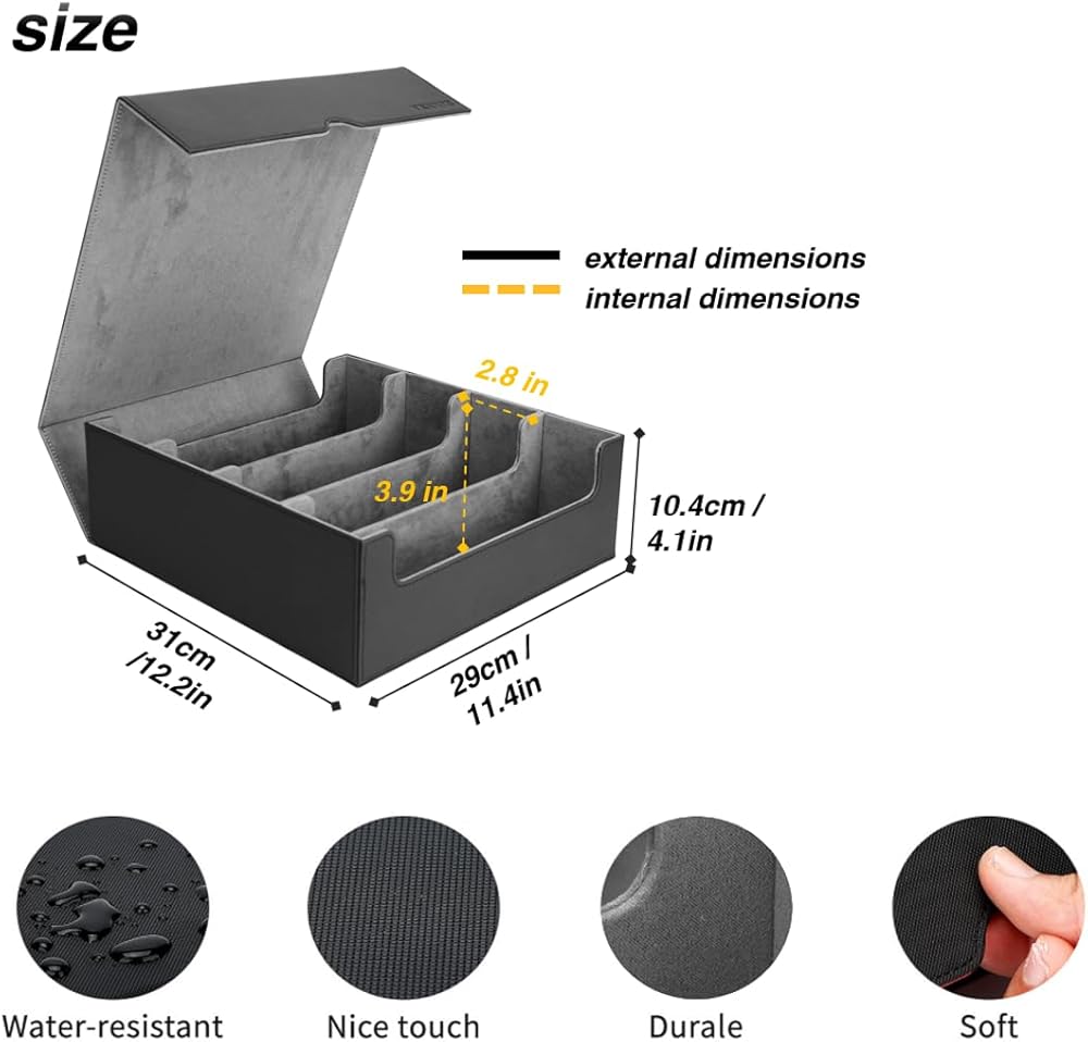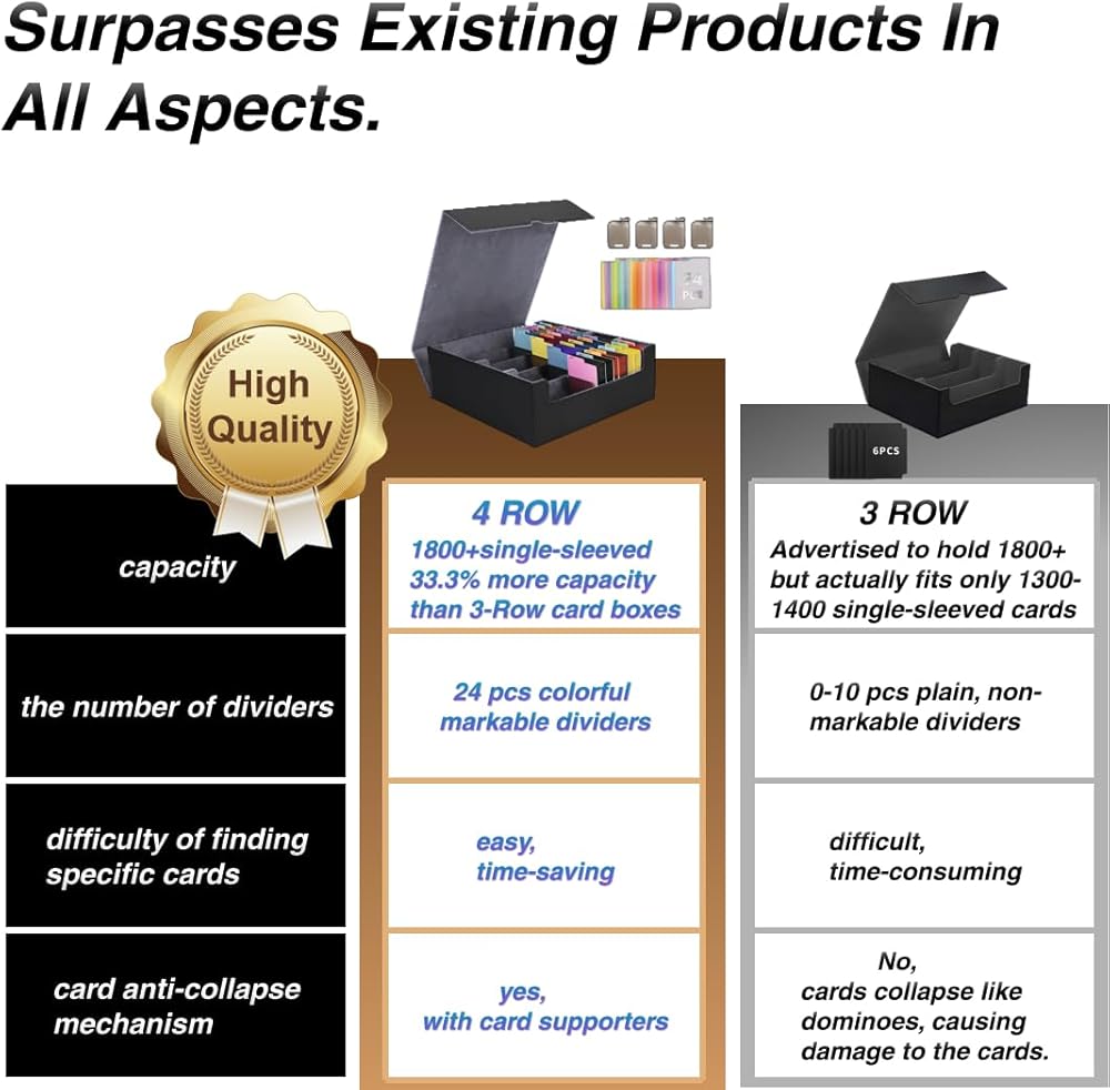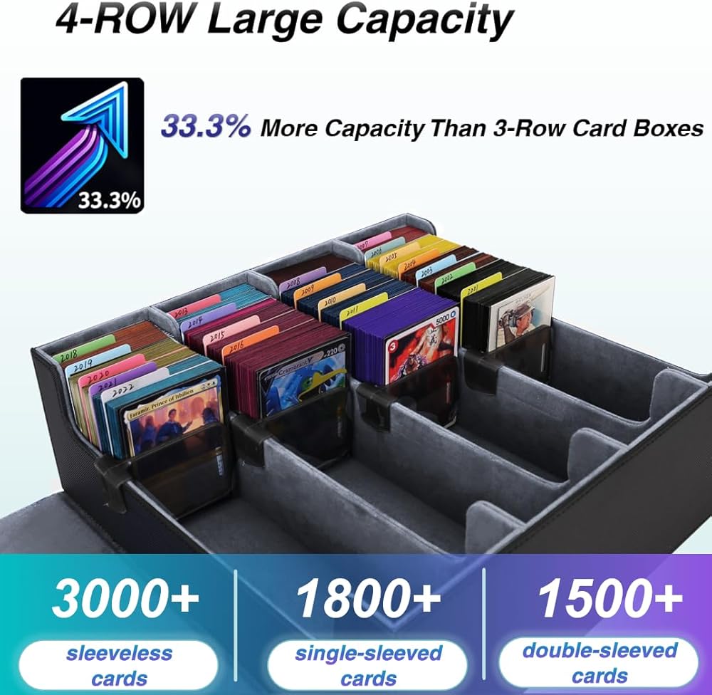 【صندوق بطاقات فائق السعة】يؤدي التبديل من علبة بطاقات قياسية ذات 3 صفوف إلى 4 صفوف إلى زيادة السعة بنسبة 33.3%. يناسب صندوق سطح السفينة TCG بشكل مريح أكثر من 3000 بطاقة بدون أكمام، أو 1800+ بطاقة ذات أكمام واحدة، أو 1500+ بطاقة مزدوجة الأكمام، باستثناء اللوادر العلوية والحوامل المغناطيسية.