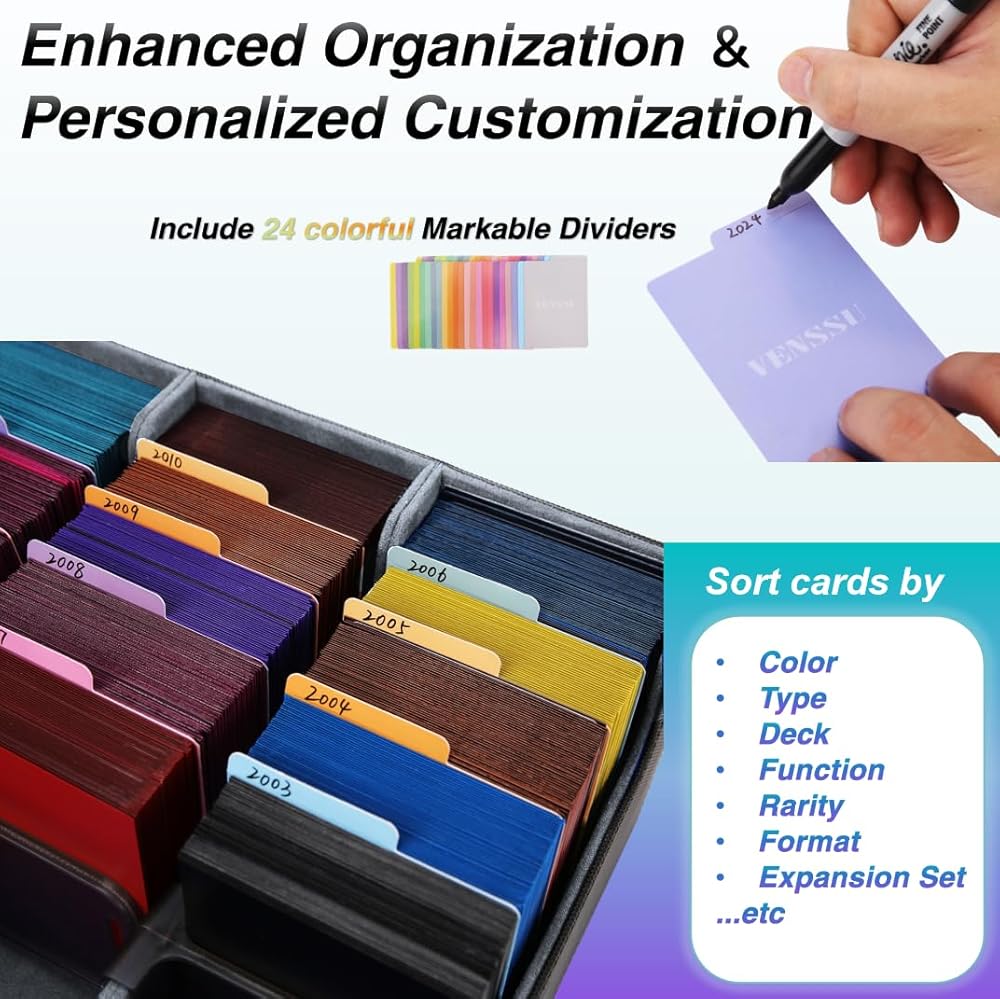 【فواصل ملونة لتنظيم بسيط】تم تجهيز وحدة تخزين البطاقات هذه بـ 24 فواصل ملونة يمكن تصنيفها، مما يجعل من السهل تنظيم وتصنيف البطاقات والملحقات. يسمح هذا الإعداد بالتعرف السريع على البطاقات واسترجاعها، مما يوفر وقت البحث ويعزز الكفاءة.