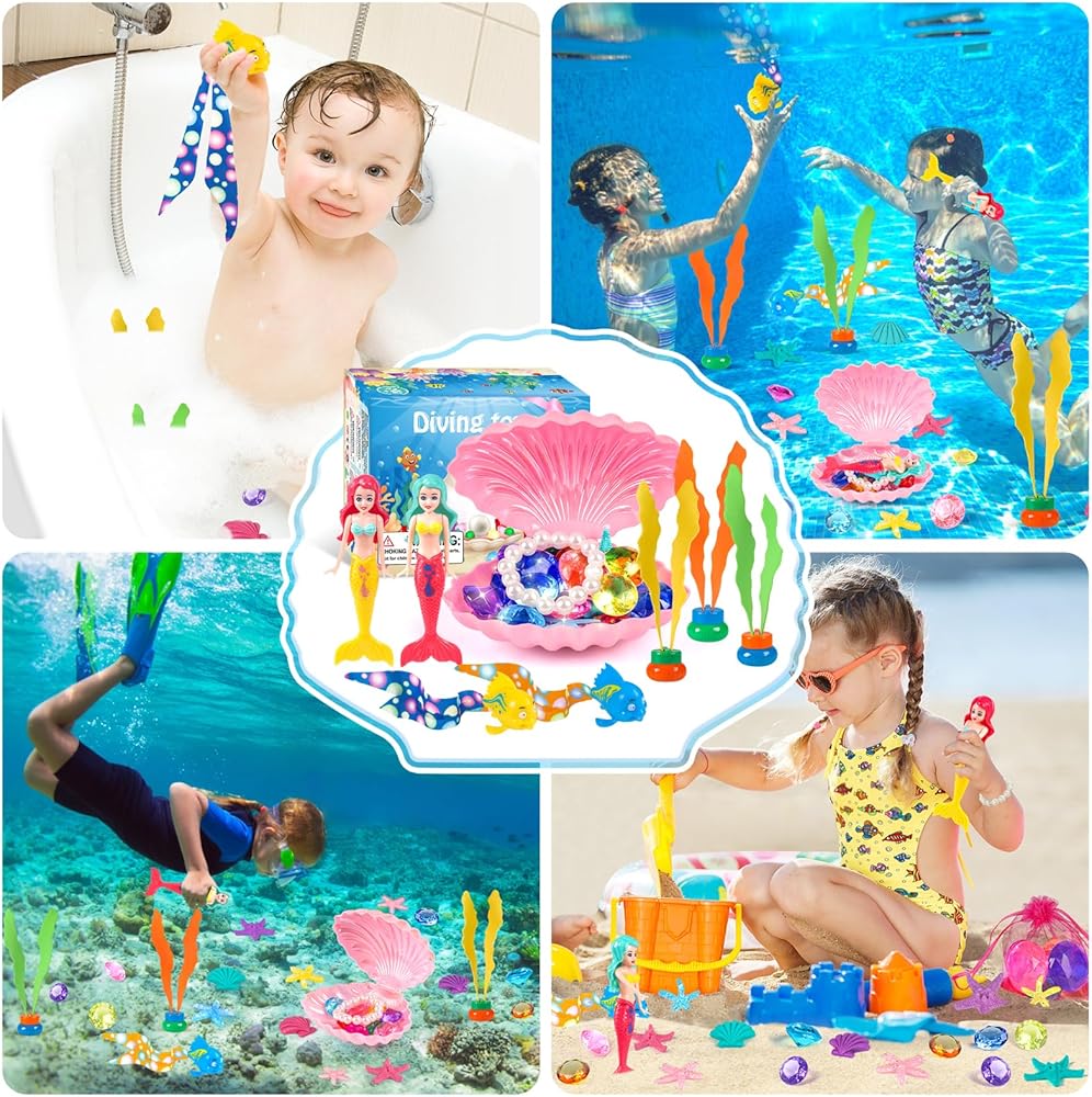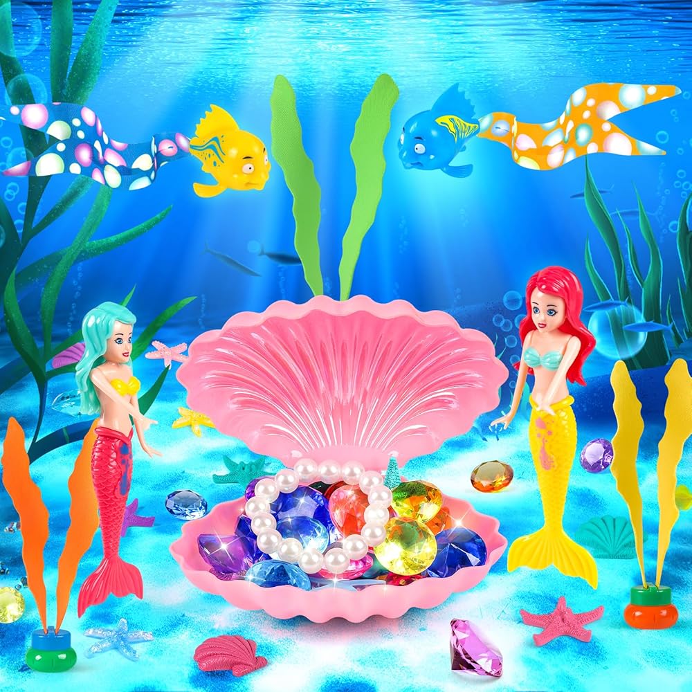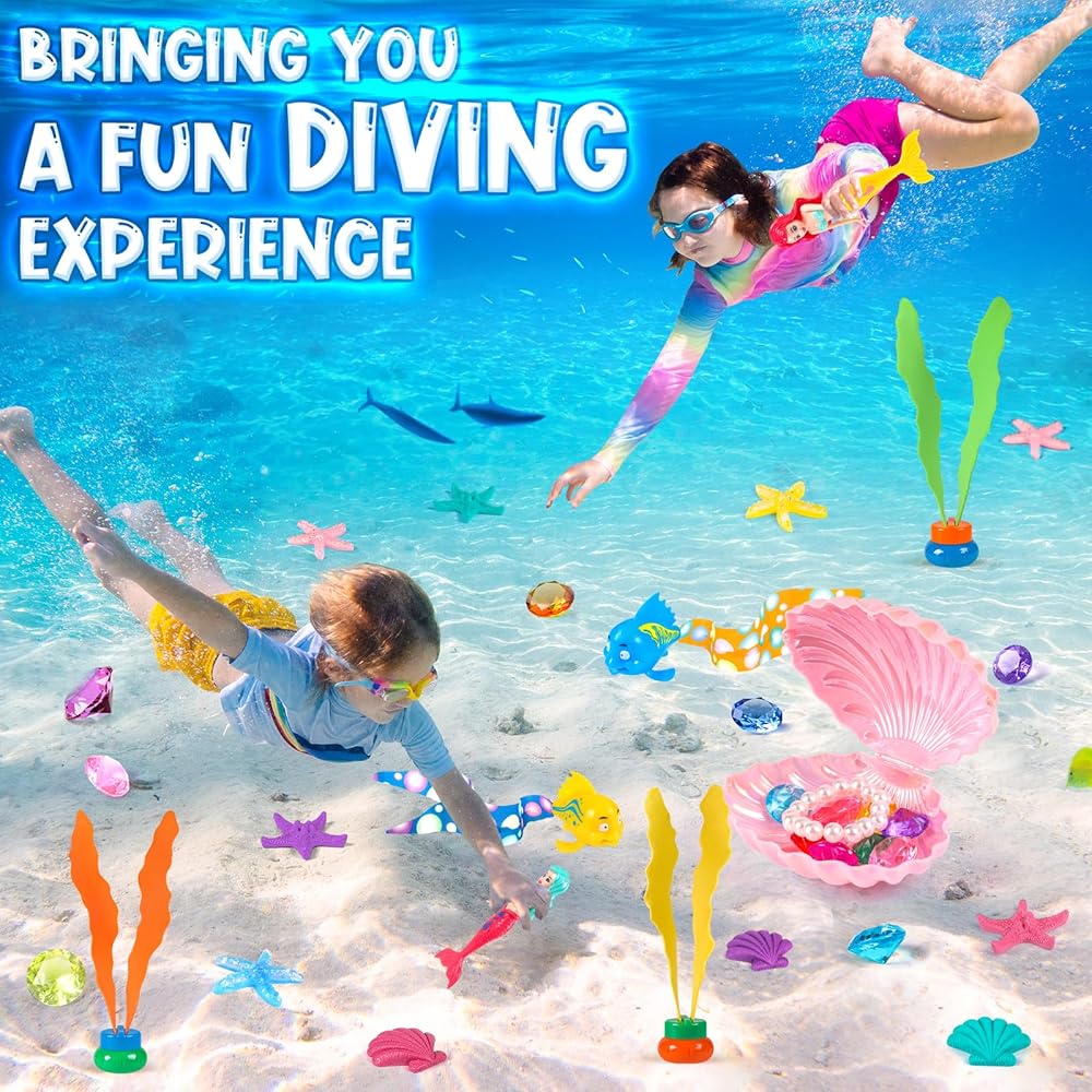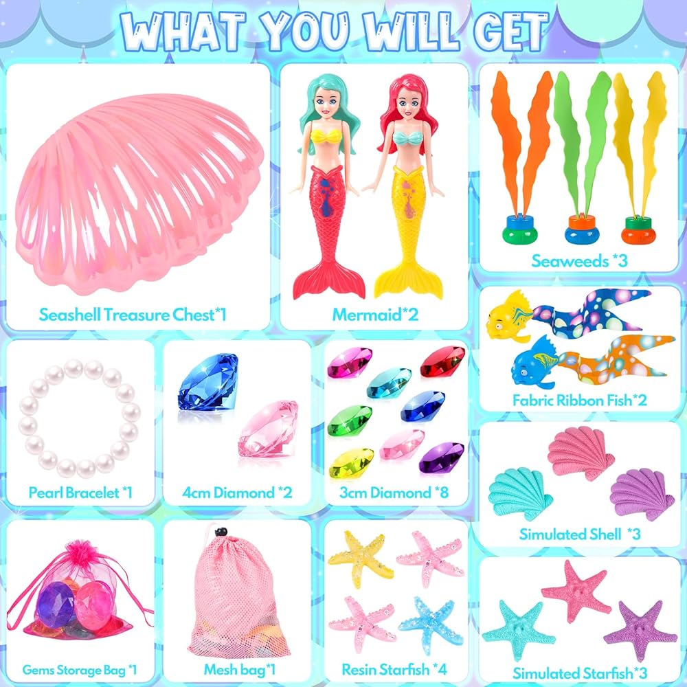 ألعاب حمام السباحة HUUIDY، 31 قطعة ألعاب حورية البحر ألعاب الغوص مع صناديق كنز الصدفة وحقيبة تخزين، ألعاب حمام السباحة مجموعة هدايا ألعاب مائية صيفية للأطفال الصغار والبنات والأولاد