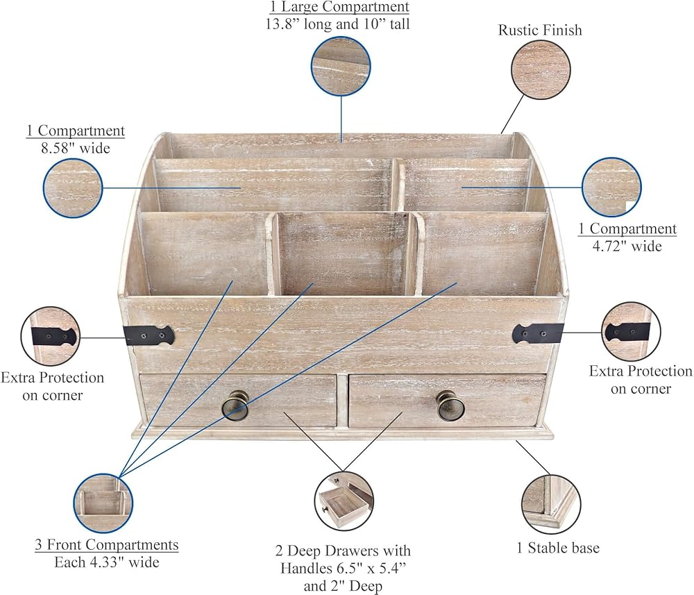 مقاس يدوم مدى الحياة - يبلغ طول الحجرة العلوية لمنظم المكتب هذا 13.8 سم وطول 25.4 سم، لذلك يمكنك تخزين مجلد الملفات مقاس 11 سم طولًا أو رأسيًا! 3 مساحات أمامية بعرض 11.43 سم تتيح لك ملاءمة هاتفك والأقلام والأظرف 4 × 6 والبطاقات والآلة الحاسبة والمزيد! الحجرتان الأوسطتان (8.58 بوصة و4.72 بوصة) عميقتان ومثاليتان للمذكرات والمقص ودفاتر الملاحظات وأجهزة iPad والأشياء التي تقف بشكل أنيق وطويل.