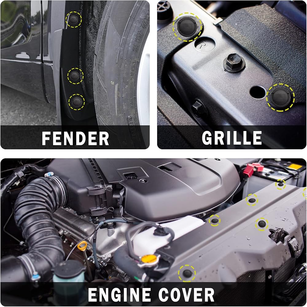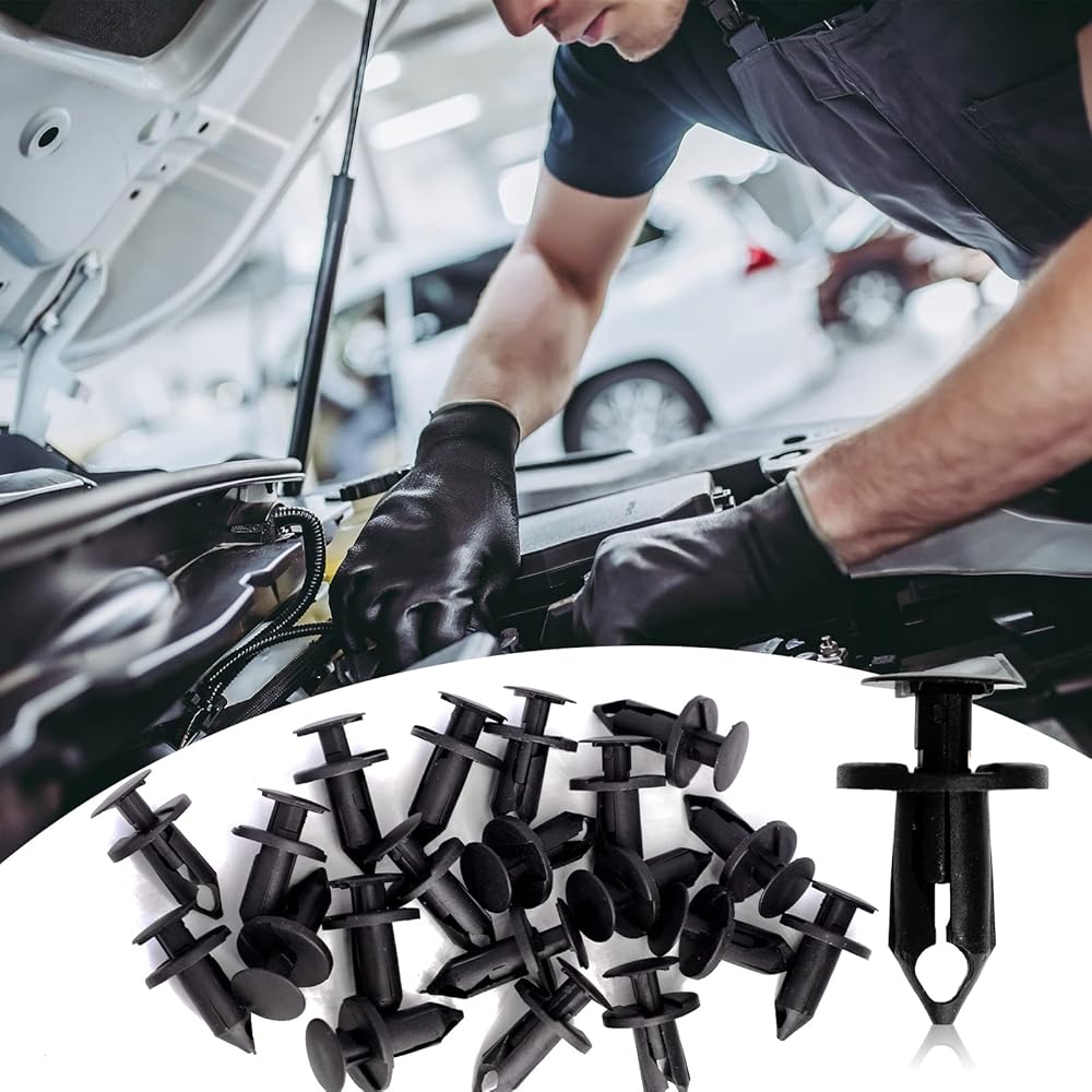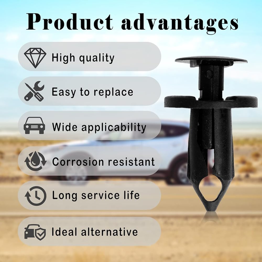 تصميم الدفع للداخل: يتم إجراء المشابك التي يتم الضغط عليها ببساطة عن طريق تثبيتها في نقاط التثبيت الخاصة بها، كما يعمل ضغط عمود التثبيت على توسيع الأرجل من أجل تثبيت سريع ومحكم. بديل أفضل لمشابك المصد والحاجز الأصلية.