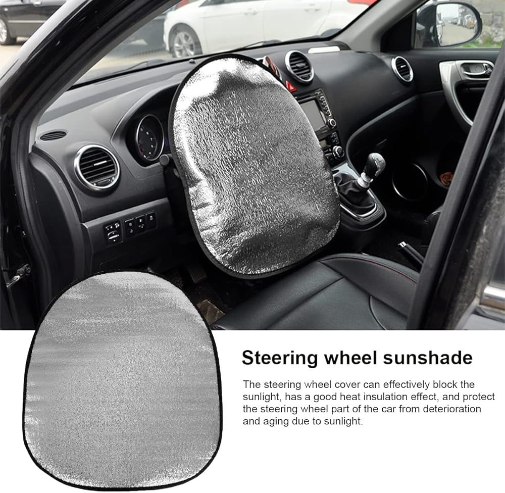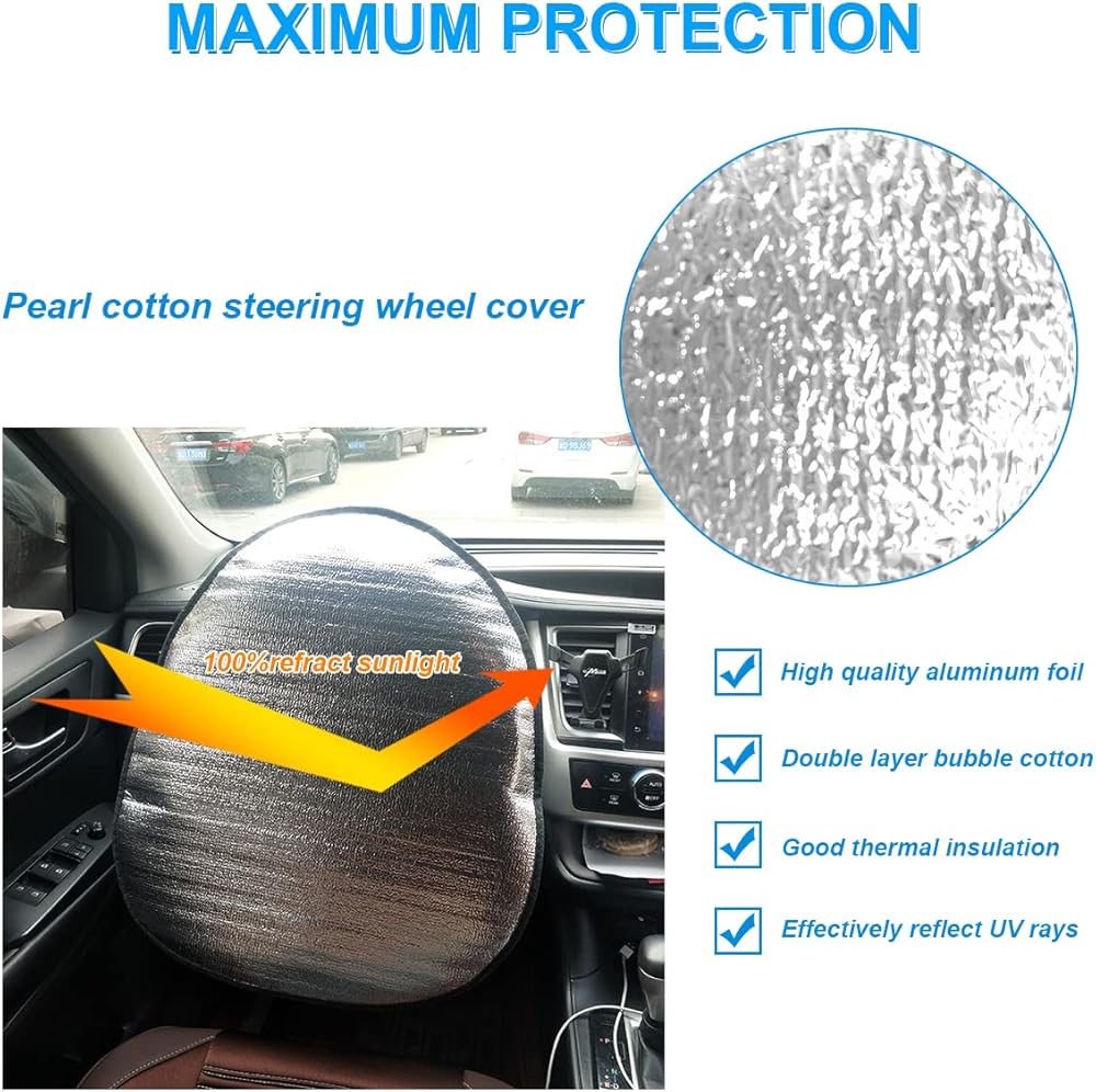 【Aluminum Film Material】: Our steering wheel sunshade is made of double thickened high quality cotton with imported aluminum film on the surface. It has a heat insulation function, a strong reflection of sunlight, a cooling effect, and the cover prevents the steering wheel temperature from rising, thus improving the driving experience.