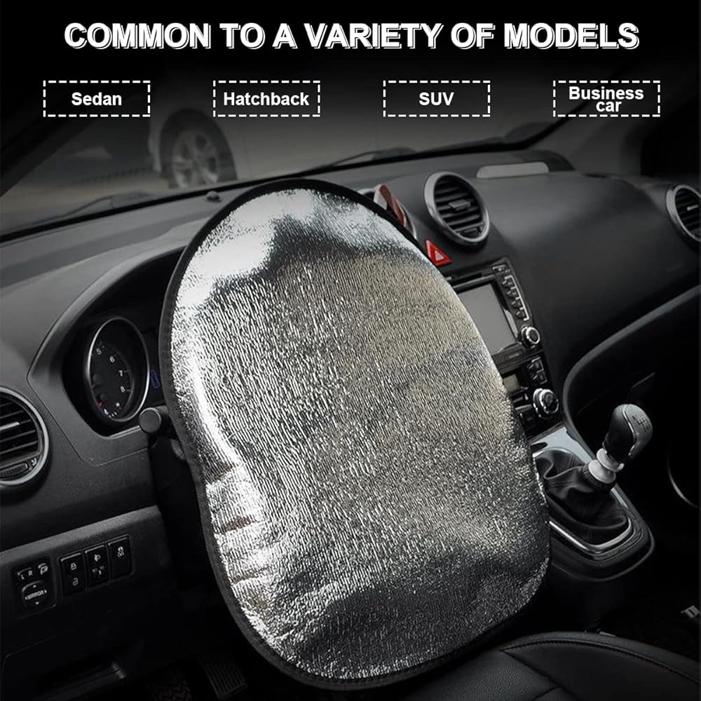 【Keep The Car Cool】: Have you ever gotten into your car on a hot day only to find that your leather steering wheel burned your hands? Or has your steering wheel ever gotten so cold that you couldn't drive without gloves? This reflective sun visor will prevent your steering wheel from reaching extreme temperatures and enhance your driving experience.