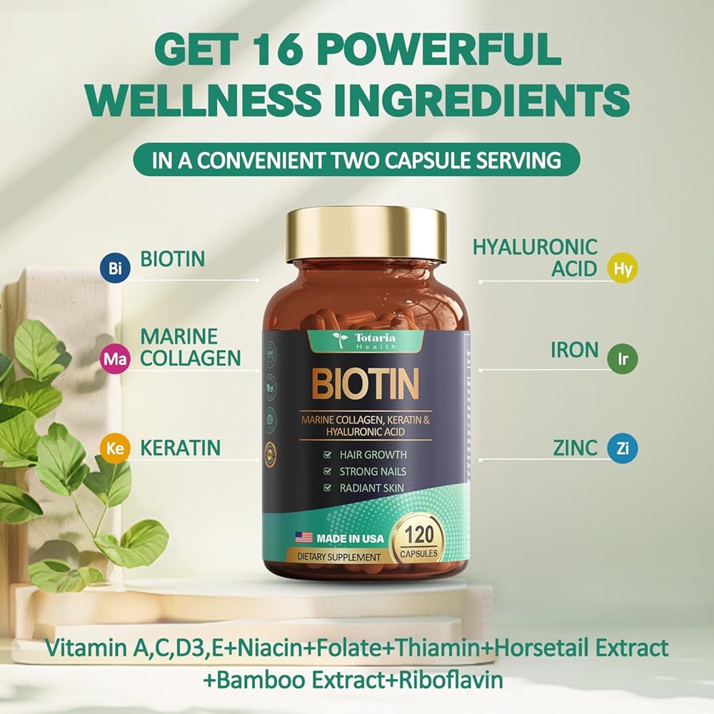 🌱البيوتين مع حمض الهيالورونيك ومكملات الكولاجين: توفر كبسولات نمو الشعر البيوتين عالية القوة للرجال والنساء 16 مكونًا نشطًا ثبت علميًا أنها تدعم نمو شعرك وقوته وصحته وسمكه وصيانته. البيوتين، الكولاجين، حمض الهيالورونيك، الكيراتين، الزنك، الكولاجين المتحلل للنساء، مستخلص الخيزران، مستخلص ذيل الحصان، الريبوفلافين، الثيامين، الحديد، فيتامين د3، فيتامين ج، فيتامين ه، فيتامين أ، مكملات النياسين التي تزود جسمك بالفيتامينات اللازمة شعر قوي وصحي مهما كان أسلوبك!