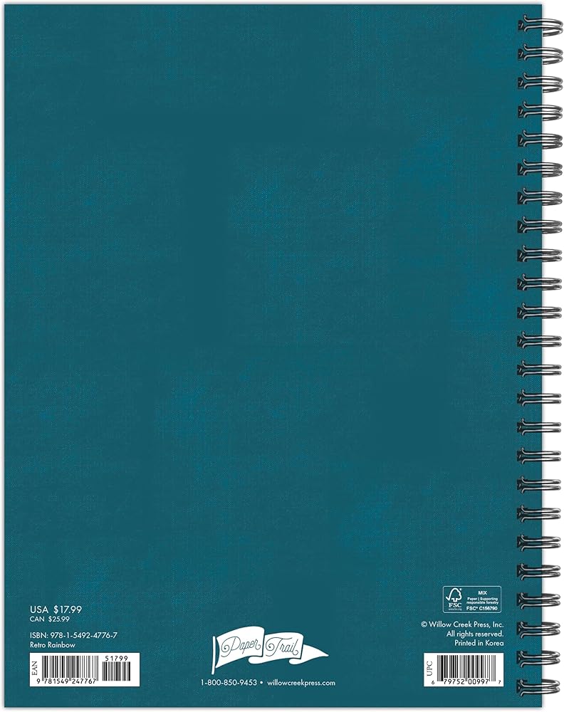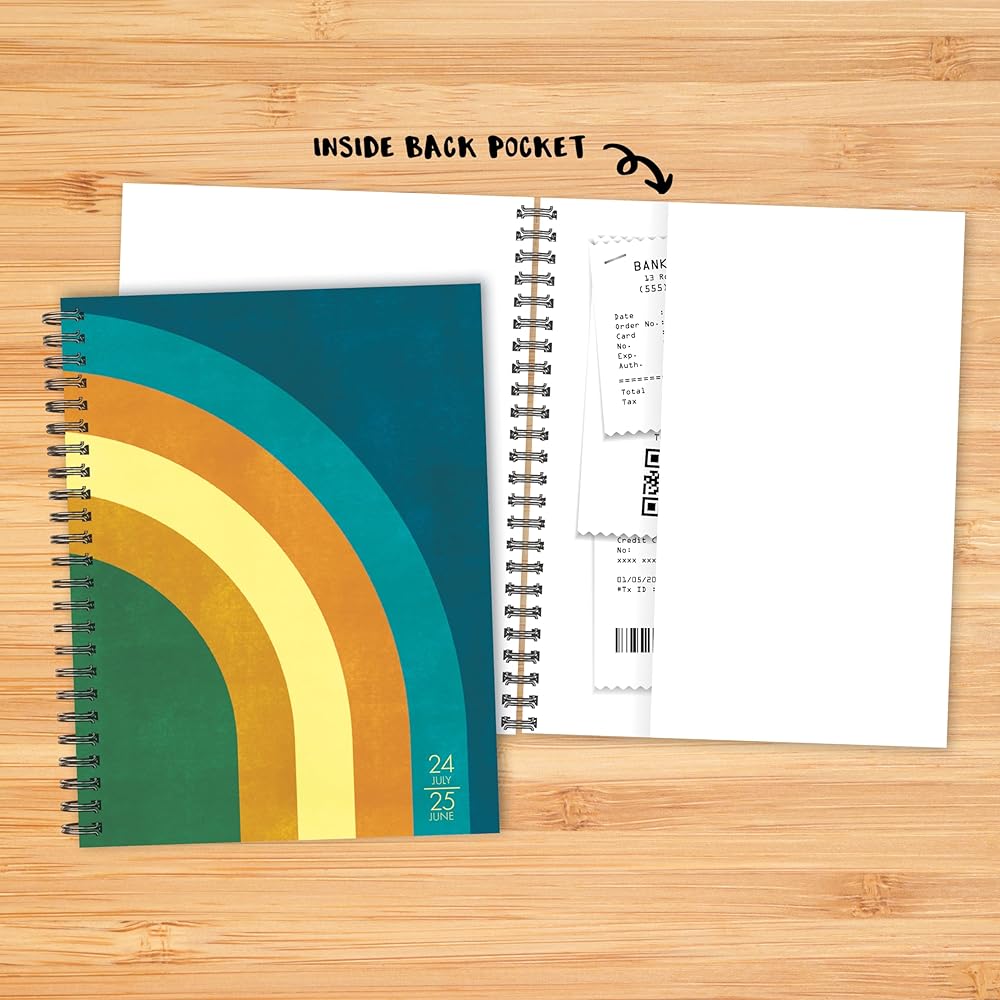 قوس الإيجابية - عد بالزمن إلى الوراء مع المخطط الأسبوعي الأكاديمي من ريترو رينبو. يذكرنا القميص العتيق، التصميم المفعم بالحيوية للأصفر المضاء بنور الشمس والأزرق البارد والأخضر الرائع يضفي أسبوعك بالحيوية والإيجابية، مما يوفر نظرة مشمسة أثناء تنقلك في العام الدراسي من يوليو 2024 إلى يونيو 2025.