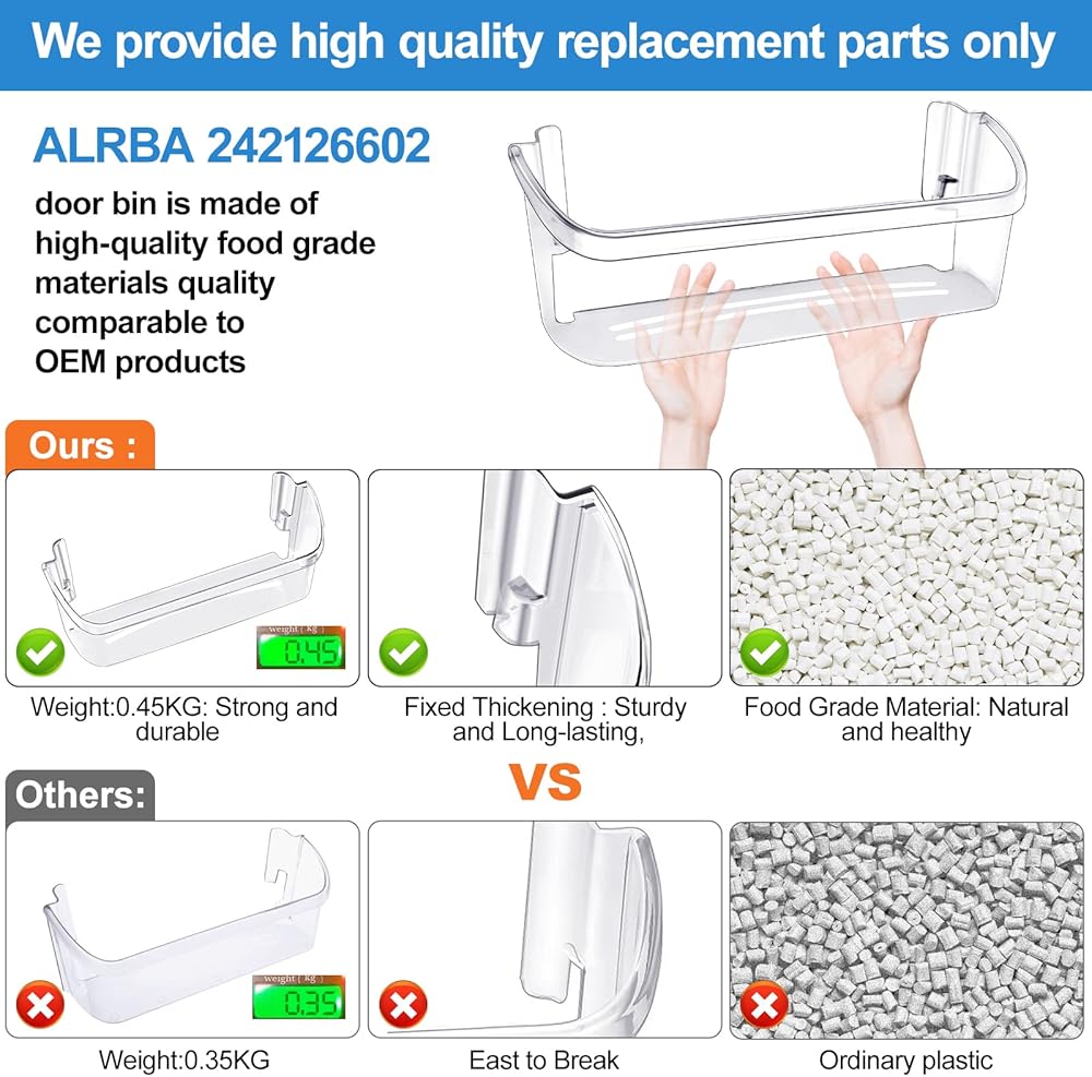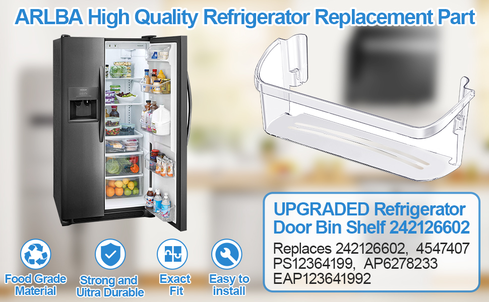 ARLBA Upgraded 242126602 refrigerator door replacement shelf box is made of food-grade materials, environmentally friendly and healthy; it uses high-quality resin materials to strengthen the side hooks and bottom corners, Even if you use force to open the refrigerator, do not worry it will falling . The support part is strengthened and thickened, it is strong and sturdy, Ensure long - lasting and effective performance.
