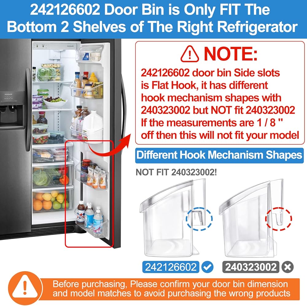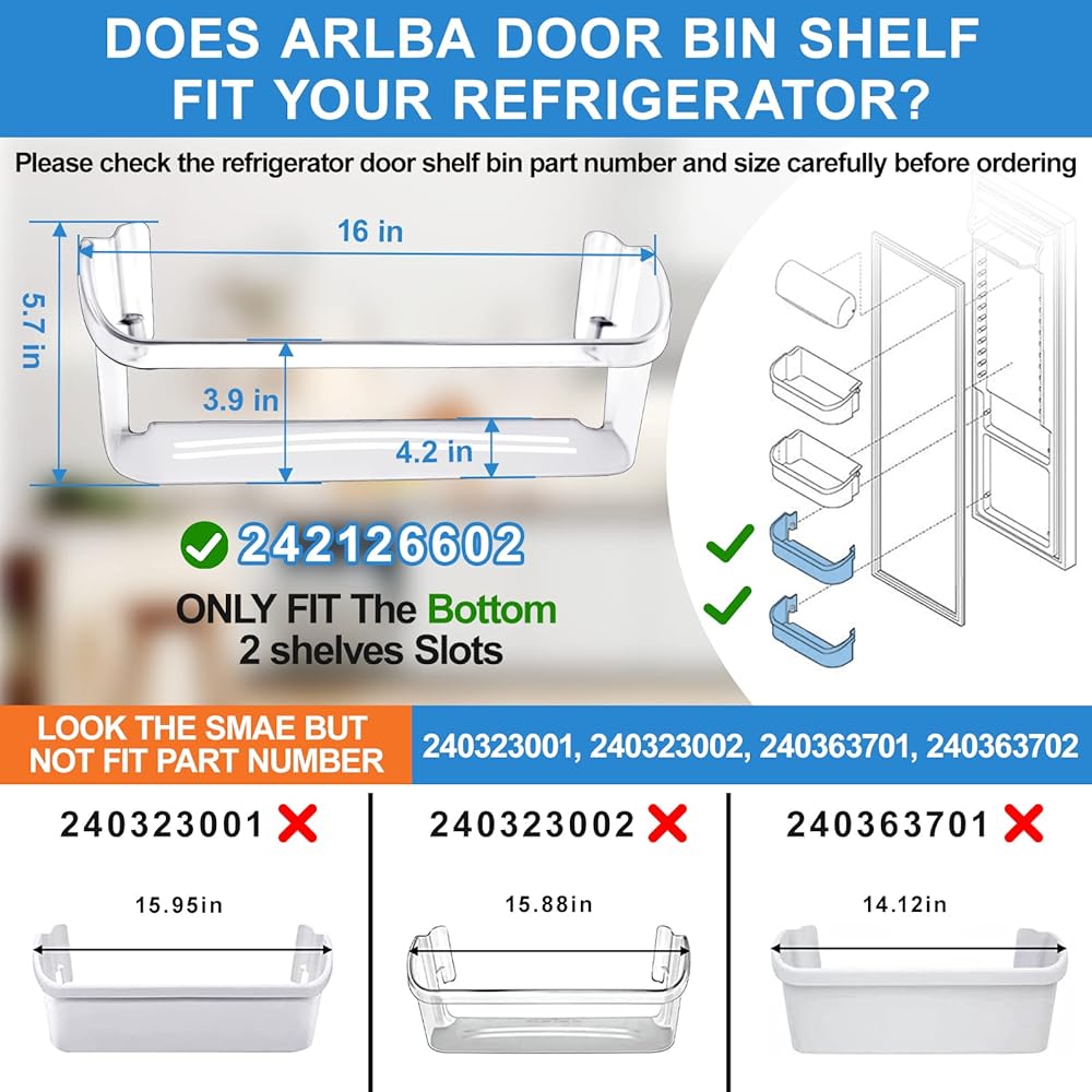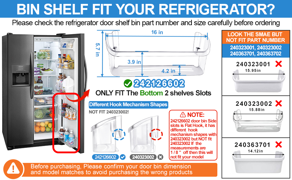 ✅【Compatible Part Numbers-Please Read Carefully】:this 242126602 door bin shelf replacement replace parts number: 242126602, 4547407, PS12364199, AP6278233, EAP12364199. NOT FIT 240323001, 240323002, 240363701. ONLY FIT Bottom 2 shelves racks of fridge and it will NOT fit the top 2 door bin shelf/racks. The Size: Length: 16", Depth: 5-1/2", Height: 5-3/4". (Please note: If the measurements are 1/8" off then this will not fit your model.).To save your time, Avoid buying wrong, Before purchasing, please confirm whether the model matches, And read our homepage and photos in detail