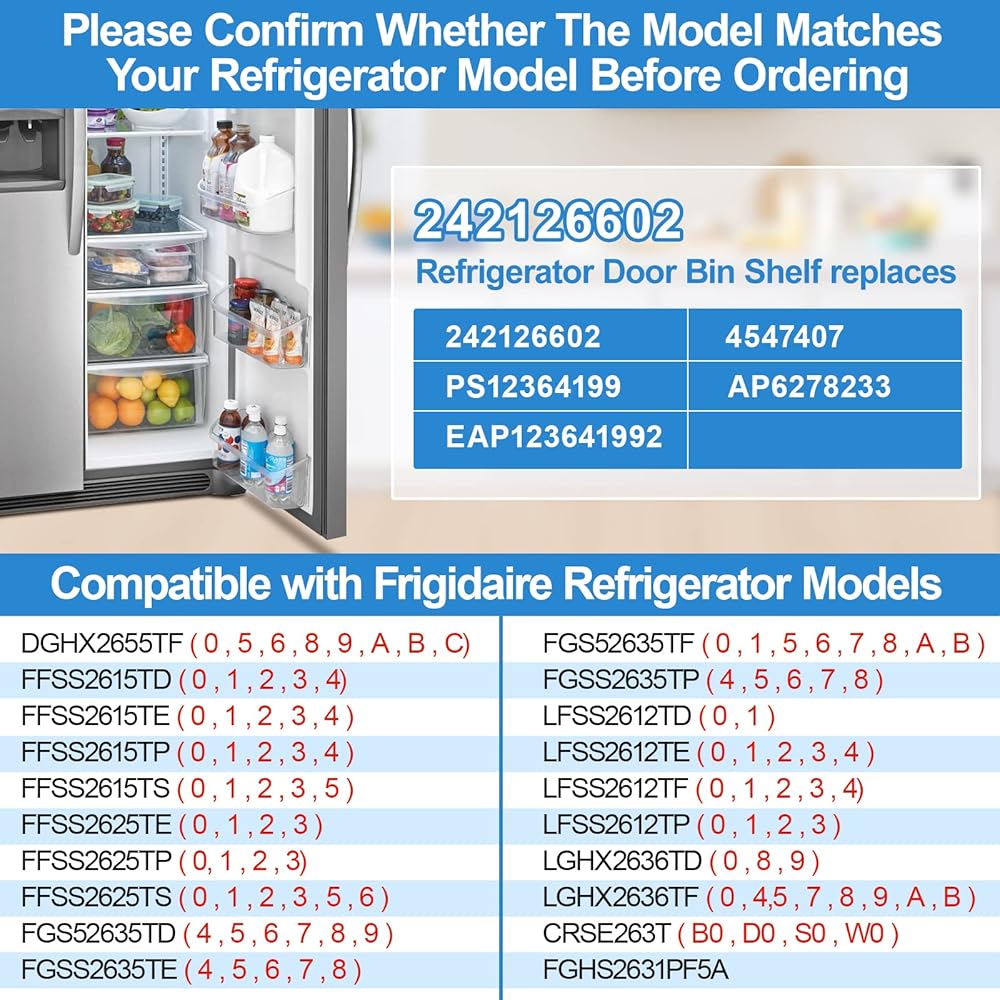 ✅【Replace Brands and Models】:The 242126602 Bottom Door Bin replaces the following models of Frigidaire and Electrolux Refrigerators, Perfect fit for the following model: FFSS2615TD, FFSS2615TE, FFSS2615TP, FFSS2615TS, FFSS2625TE, FFSS2625TP, FFSS2625TS, FGSS2635TD, FGSS2635TE, FGSS2635TF, FGSS2635TP, LFSS2612TD, LFSS2612TE, LFSS2612TF, LFSS2612TP, LGHX2636TD, LGHX2636TF, CRSE263TB, CRSE263TD, CRSE263TS, CRSE263TW, DGHX2355TF FGHS2631PF5A etc
