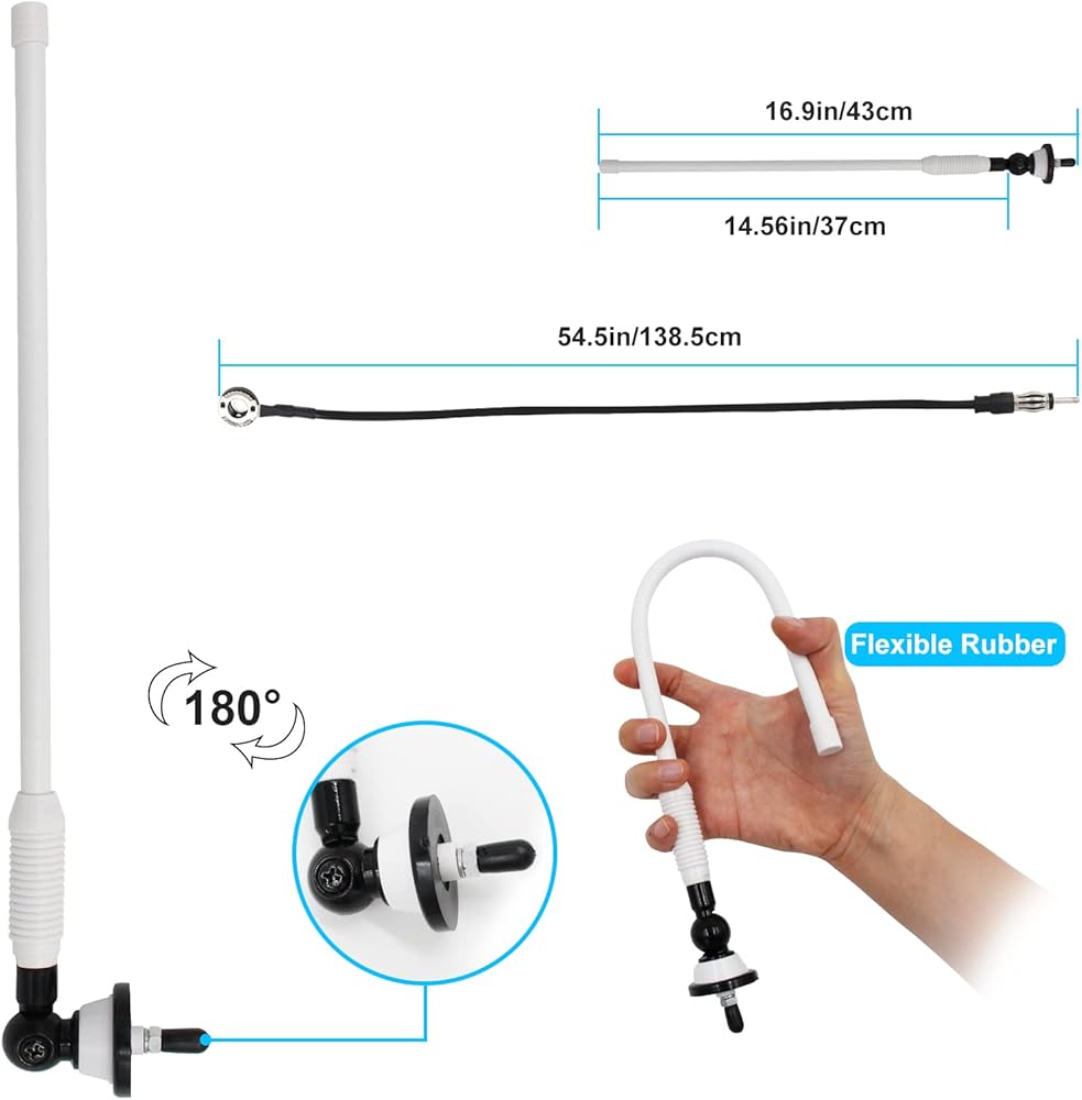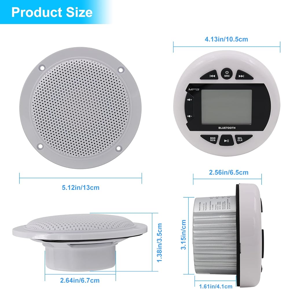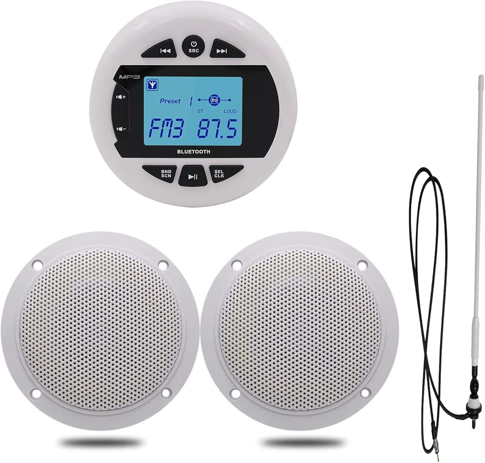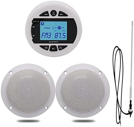 مجموعة راديو ومكبرات الصوت من Herdio Marine، وحدة رأس قياس بحري متوافقة مع بلوتوث + مكبرات صوت مثبتة على الحائط بسقف بحري مقاس 4 بوصة + هوائي FM AM مطاطي مرن (أبيض)