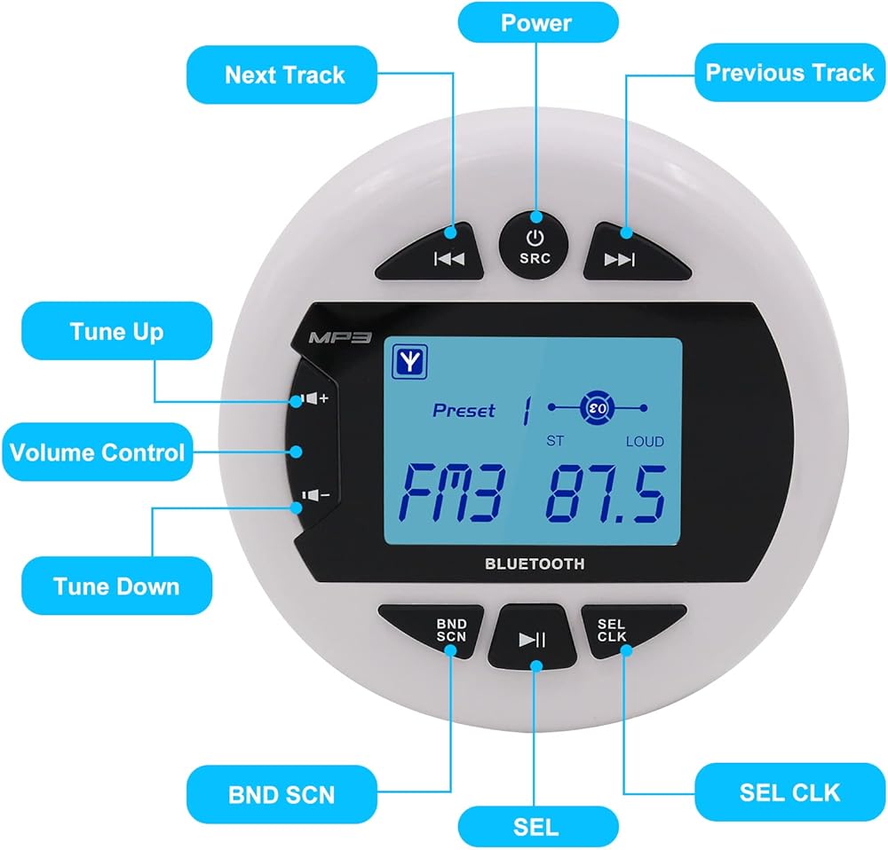 *متوافق مع تقنية البلوتوث: يحتوي راديو ستيريو مستقبل الوسائط الرقمية البحرية هذا على تقنية مدمجة مع نطاق 10 أقدام لبث الصوت اللاسلكي. قم بتشغيل الموسيقى والتحكم فيها من خلال هاتفك الذكي أو مشغل MP3.