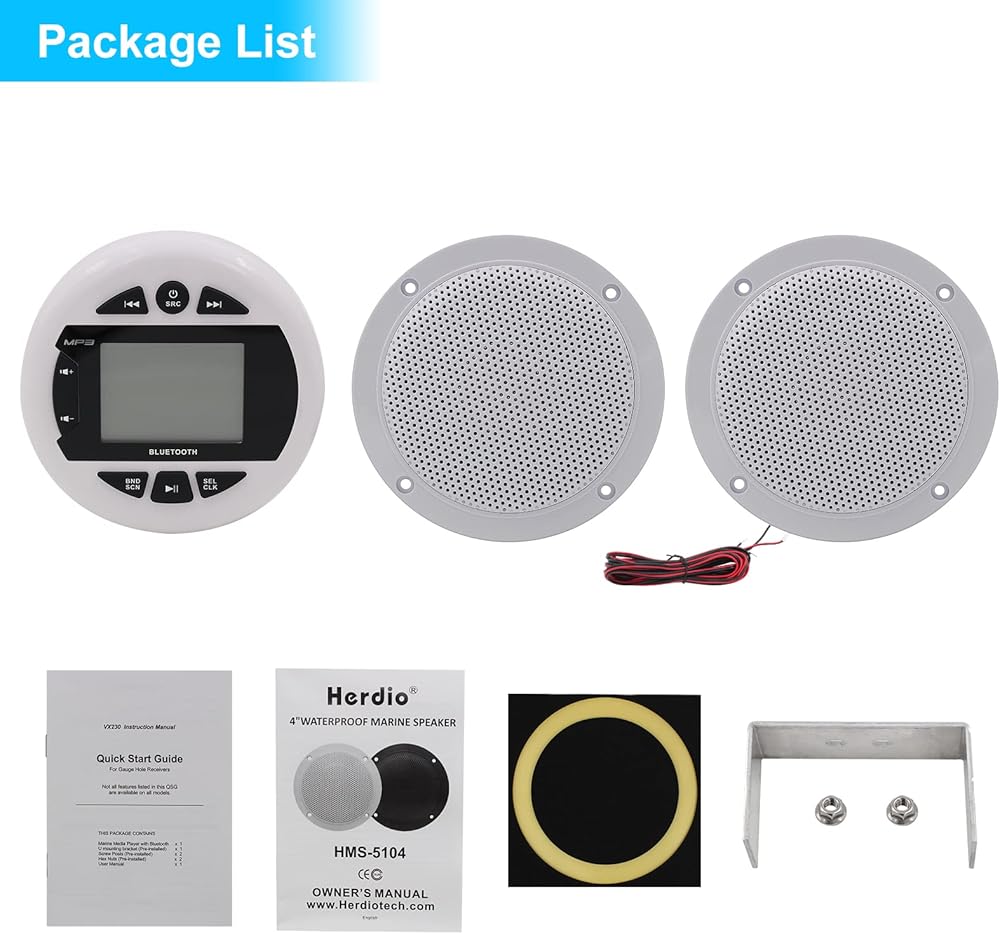 *محتويات العبوة: 1 جهاز استقبال راديو Herdio Marine USB AUX AM/FM + زوج واحد من مكبرات الصوت البحرية Herdio 100W 4 بوصة 160W (أبيض)+1 هوائي بحري مرن مقاوم للماء من Herdio.