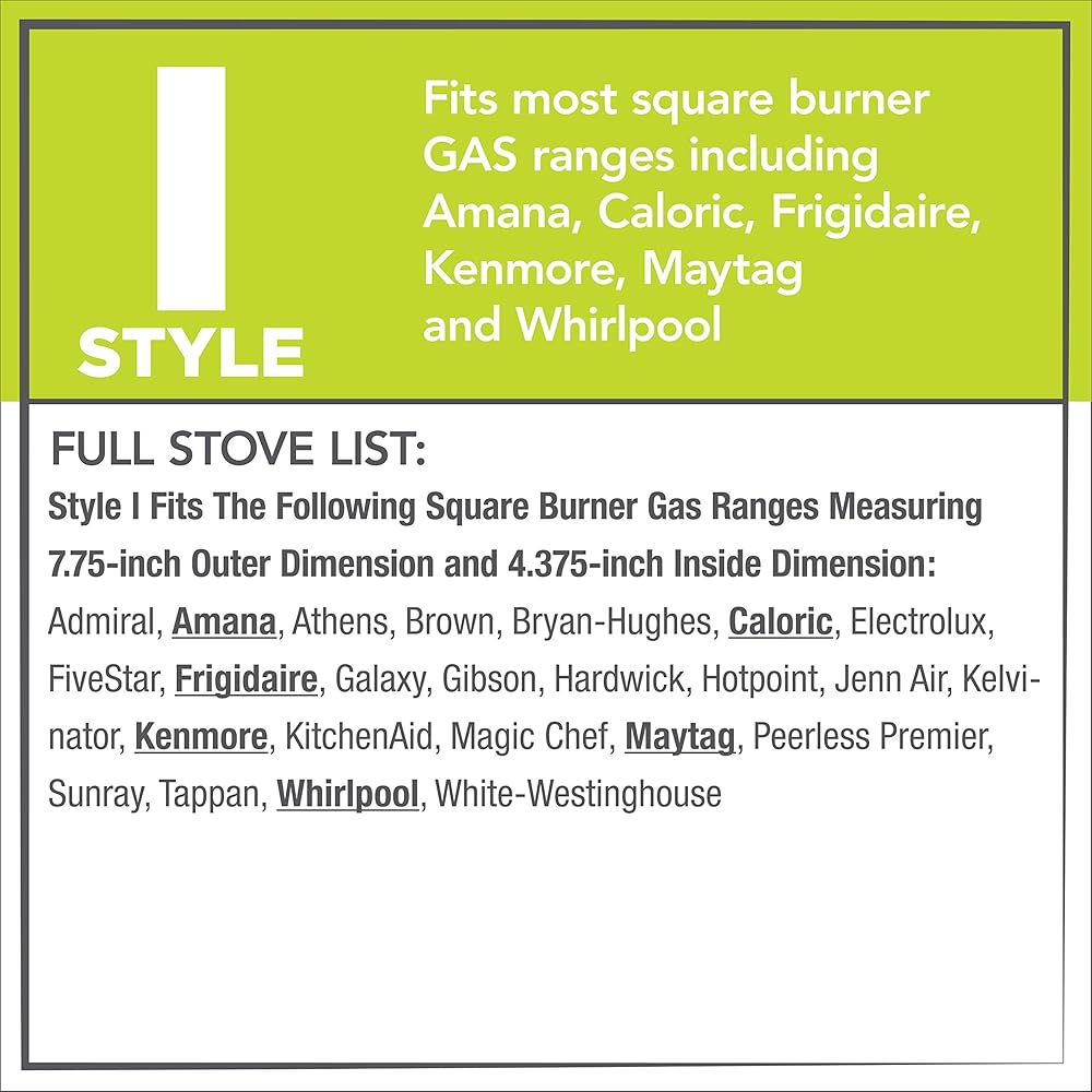 يناسب معظم نطاقات غاز الموقد المربعة بما في ذلك: أمانا كالوريك، فريجيدير، كينمور، مايتاغ، وويرلبول.
