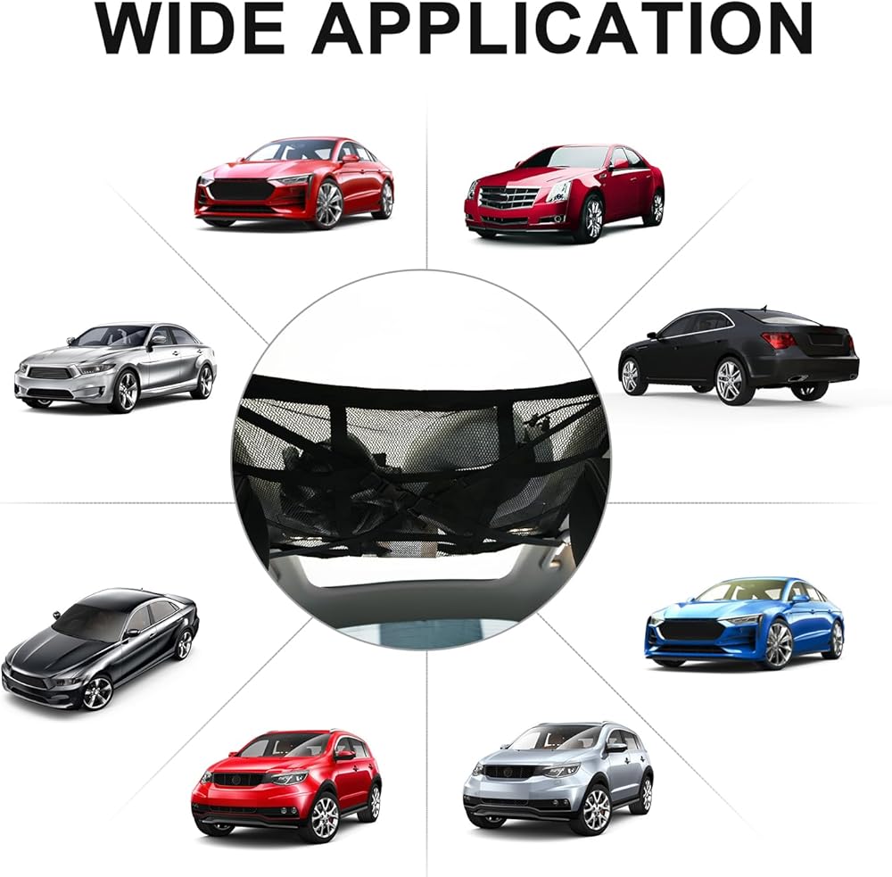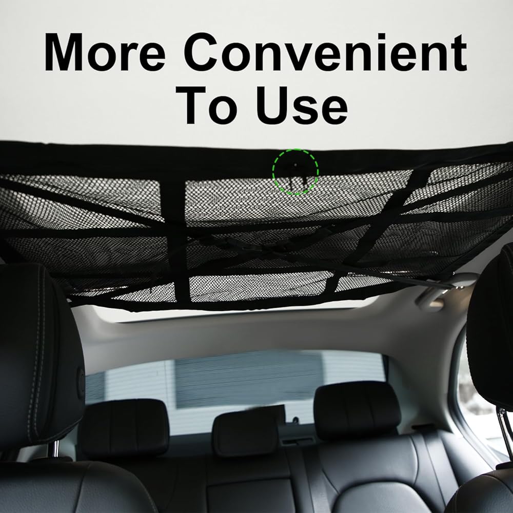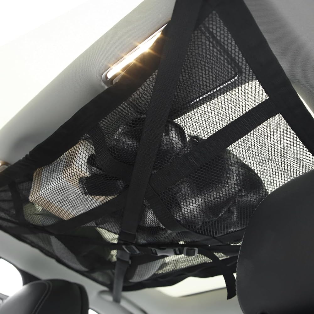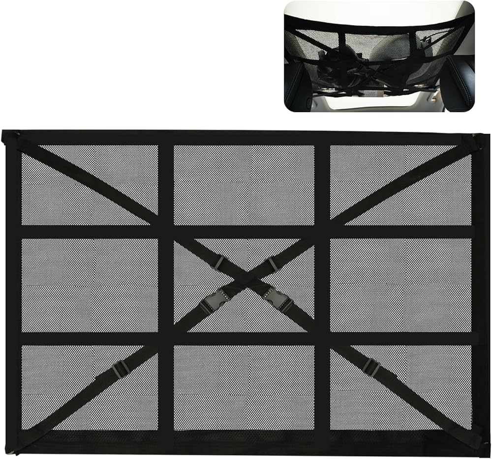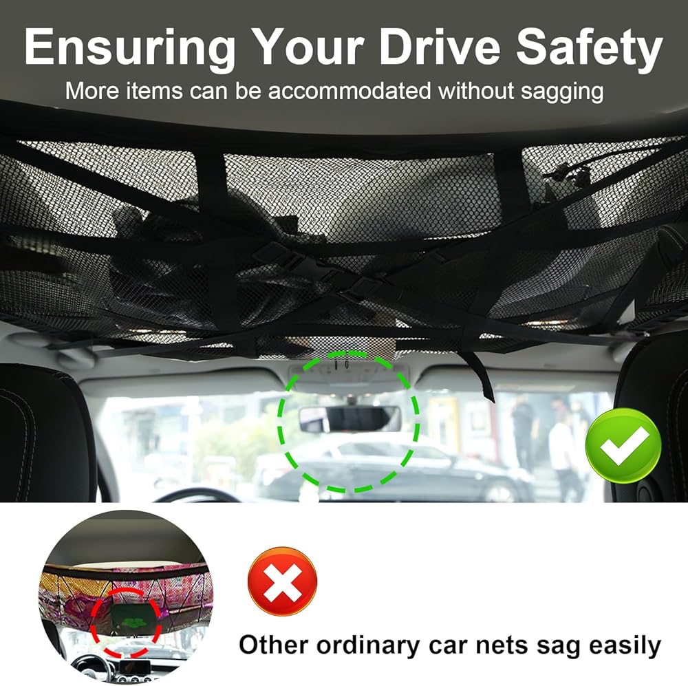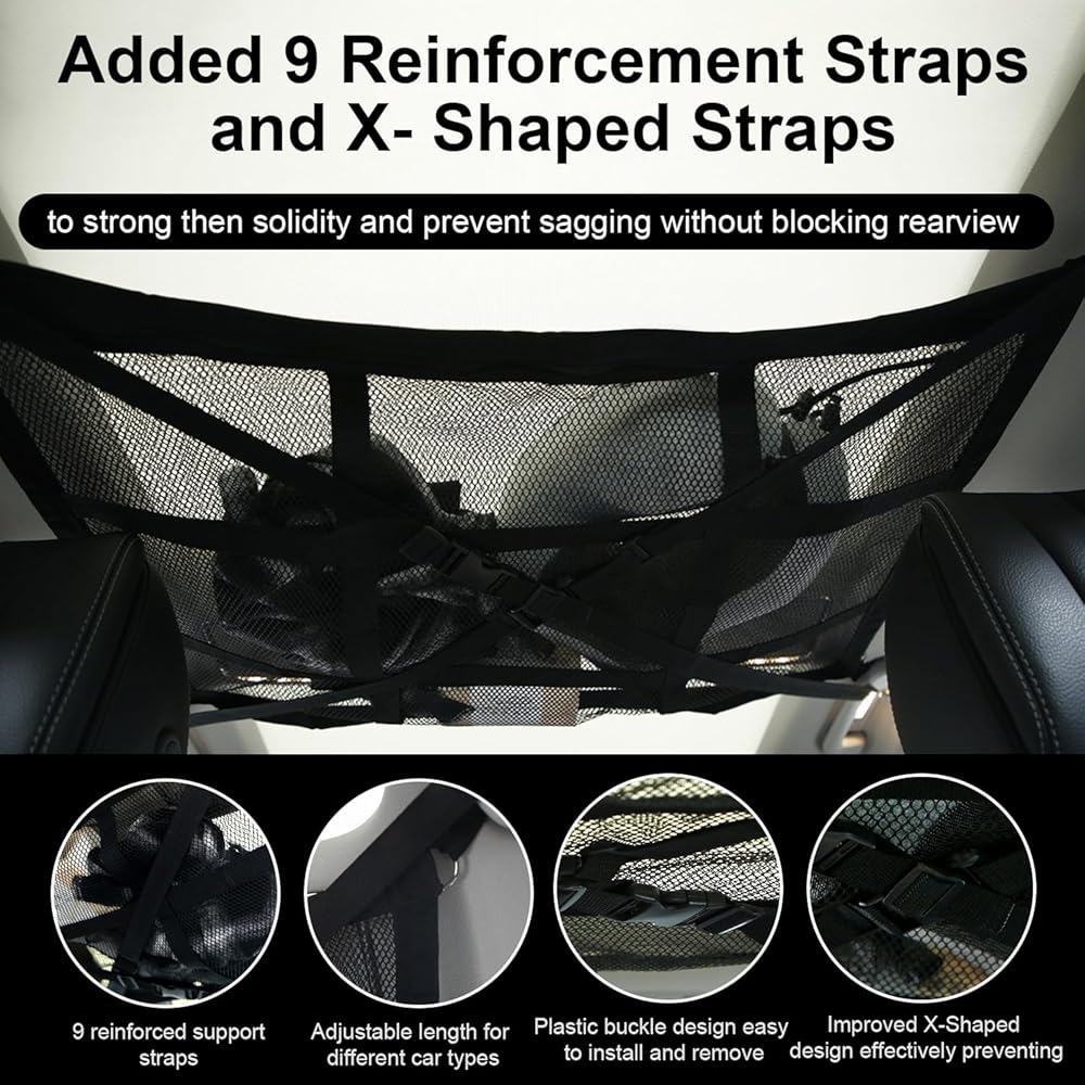 Product Feature: Our car ceiling cargo net has nine-square grid reinforcement straps, and also adds X-shaped load-bearing straps, which can easily adjust the elastic cargo net, which can hold up to 20 gallons of items, which can better prevent sagging and not block the rear view.