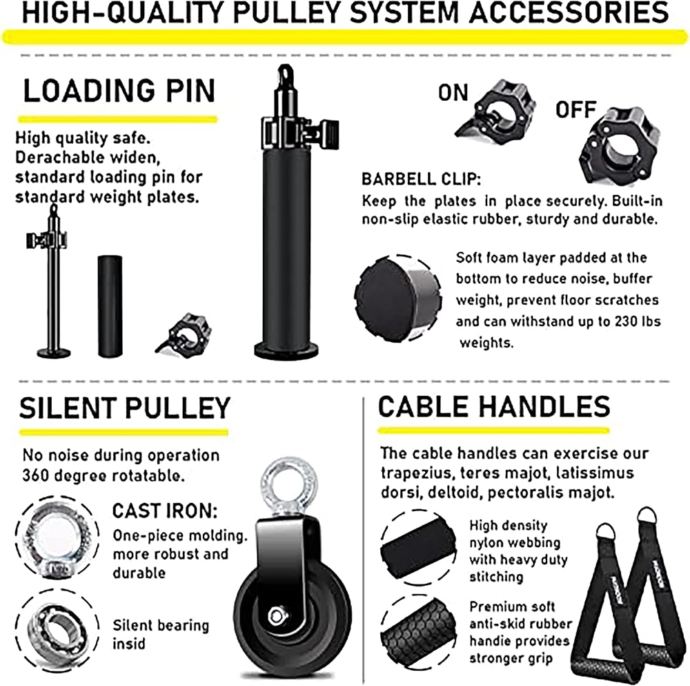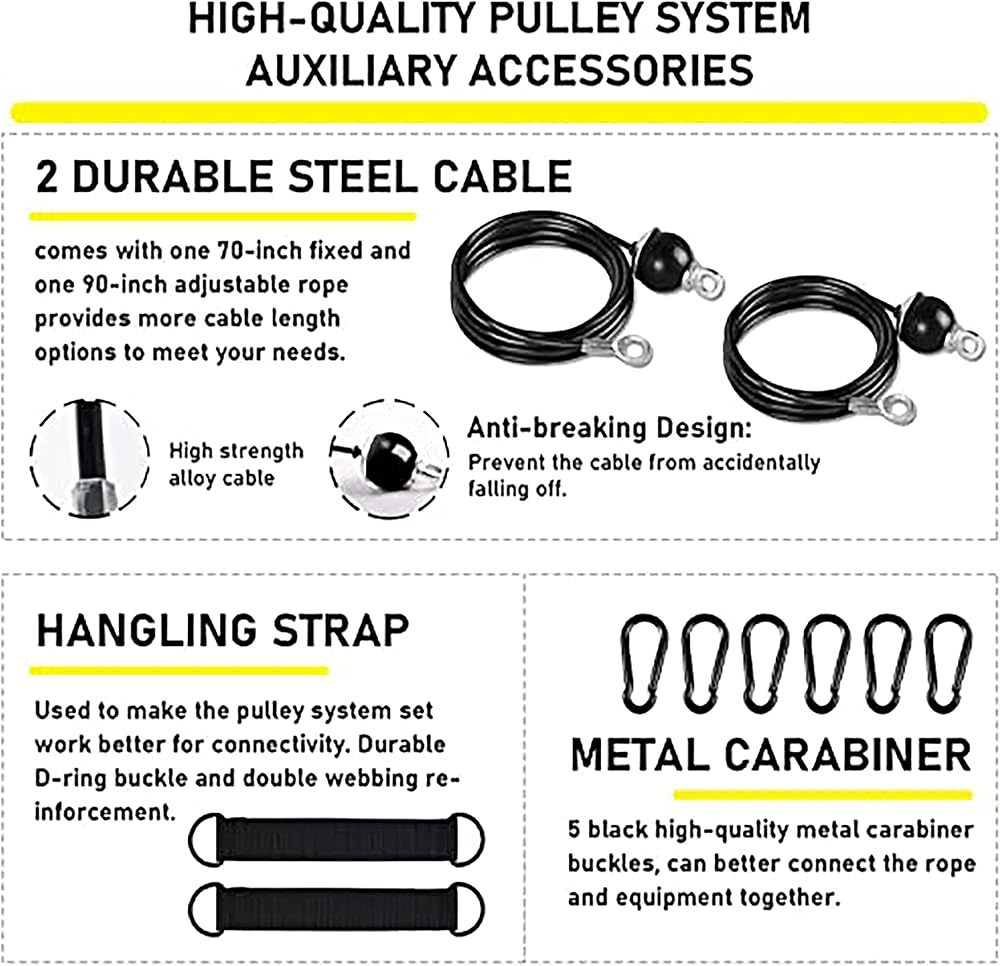 💪【مادة احترافية ومتميزة】تم تصميم كل ملحق من نظام بكرة التمرين الخاص بنا بعناية وبجودة جيدة، وهي قادرة على تحمل جلسات التمرين اليومية المكثفة. دبوس التحميل المطور مصنوع من الفولاذ السميك، والجزء السفلي مزود بإسفنجة إضافية لضمان أرضيتك من التلف. بكرة صامتة ذات طاولة دوارة 360 درجة، تضمن الهدوء والثبات لتشغيل نظام البكرة؛ يأتي بمقاسين (70 بوصة و90 بوصة) كابل عالي المستوى لتلبية احتياجاتك المختلفة.