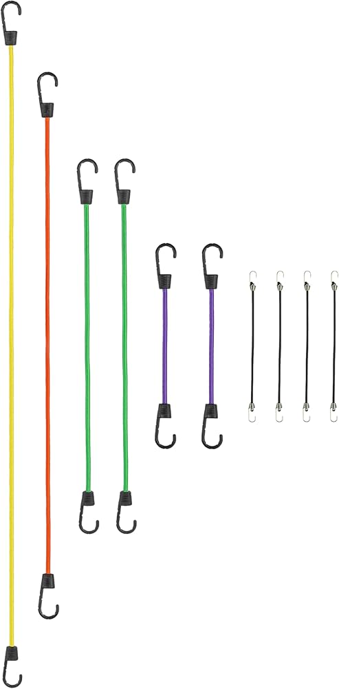 ASSORTMENT OF BUNGEES – Featuring 10 pieces, this Bungee Cords with Hooks Set includes two 12in (31cm), two 24in (61cm), one 36in (91cm), one 48in (122cm), and four mini bungees.