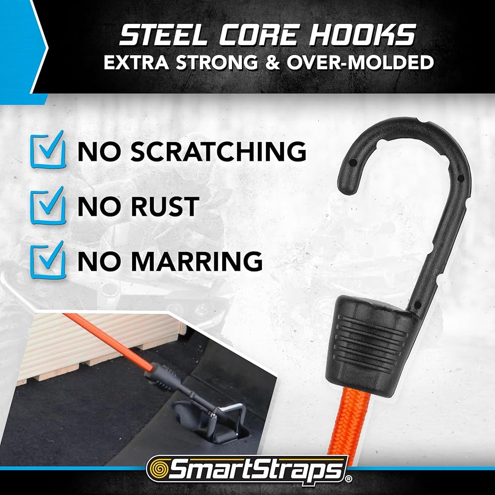 PROTECT YOUR VEHICLE AND CARGO – This bungee cord set features super strong steel S-hooks that will not lose their shape, or scratch and mar your vehicle. The bungees double jacket cover provides superior wear resistance and UV protection.
