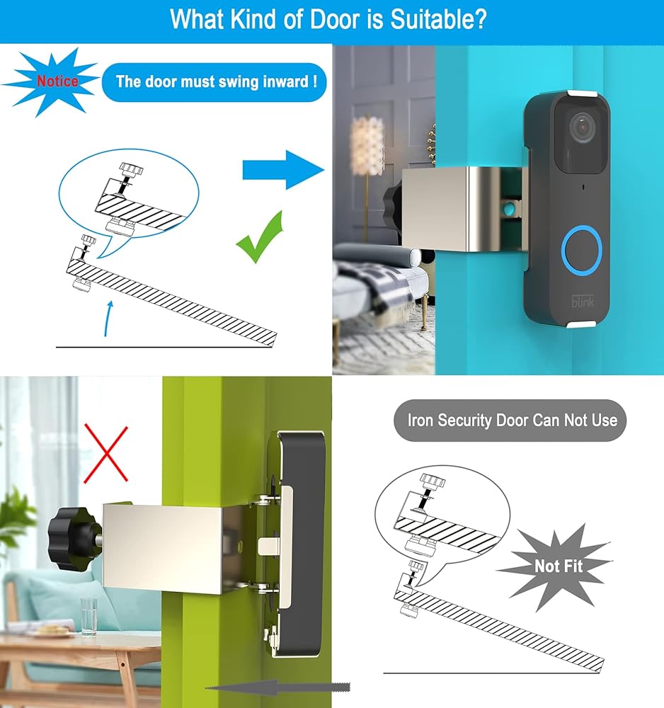 ✅【مصنوع من الفولاذ المقاوم للصدأ الصلب 304 】 ---- يتم تجميع الدعامة بأكملها عن طريق ثني الفولاذ المقاوم للصدأ 30 الصلب. على الرغم من أن عملية التصنيع معقدة، إلا أنها مريحة للغاية في الاستخدام. أصعب بكثير من الألومنيوم أو البلاستيك. لا يمكن إزالته من جانب الباب الخاص بك إلا إذا كان الباب مفتوحًا، مما يجعل من المستحيل سرقة حامل الباب VMEI وجرس الباب بالفيديو Blink أثناء إغلاق الباب.