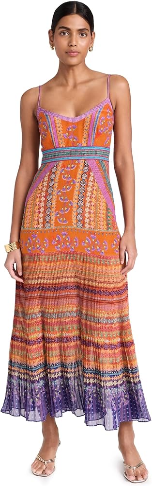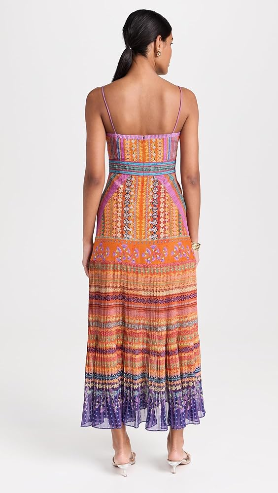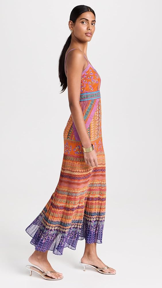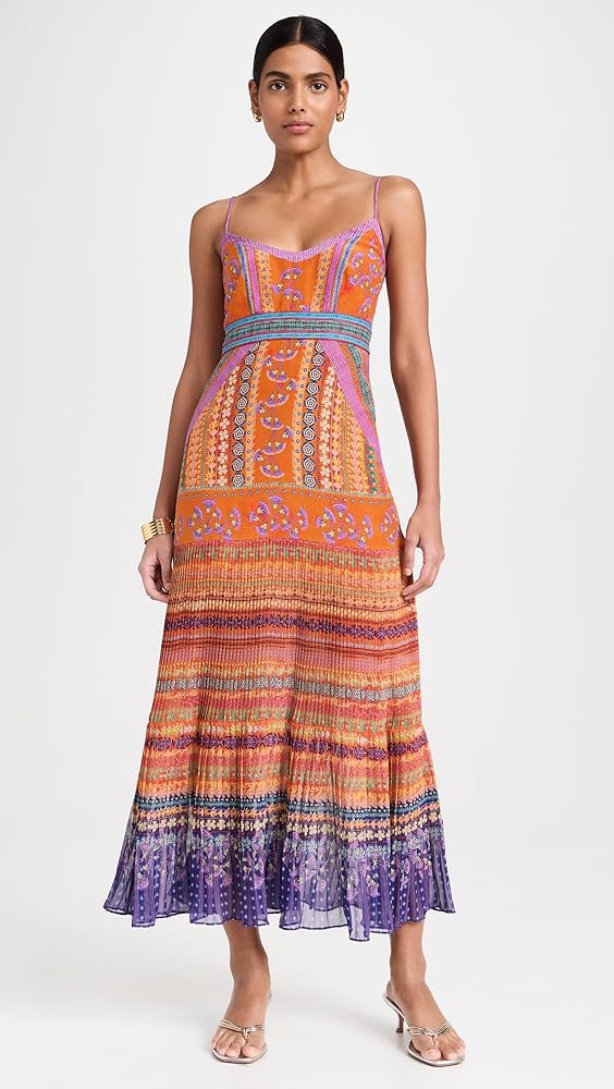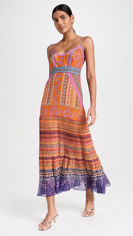 - أحزمة كتف رفيعة ثابتة، خصر منسدل وتنورة مطوية