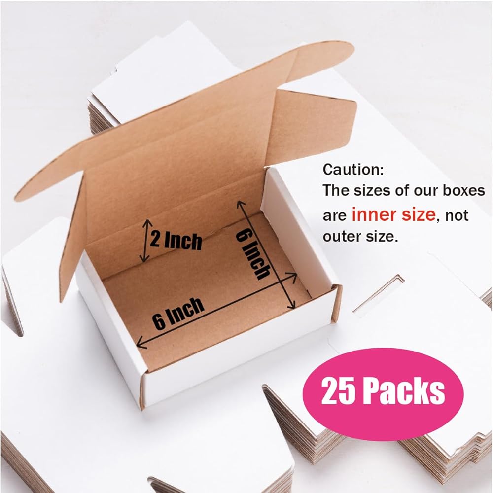 ★حزم صغيرة لصناديق الشحن القيمة★ حزمة من صناديق البريد الصغيرة البيضاء تتضمن 25 صندوق هدايا. يبلغ مقاس كل صندوق شحن 6 × 6 × 2 بوصة حجم داخلي، و7 × 6.25 × 2.25 بوصة حجم خارجي.