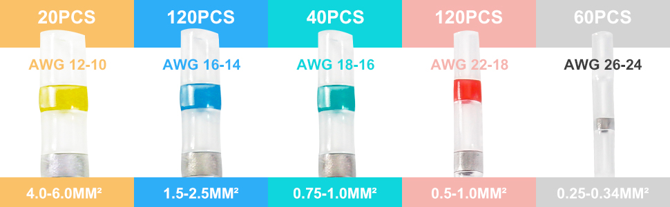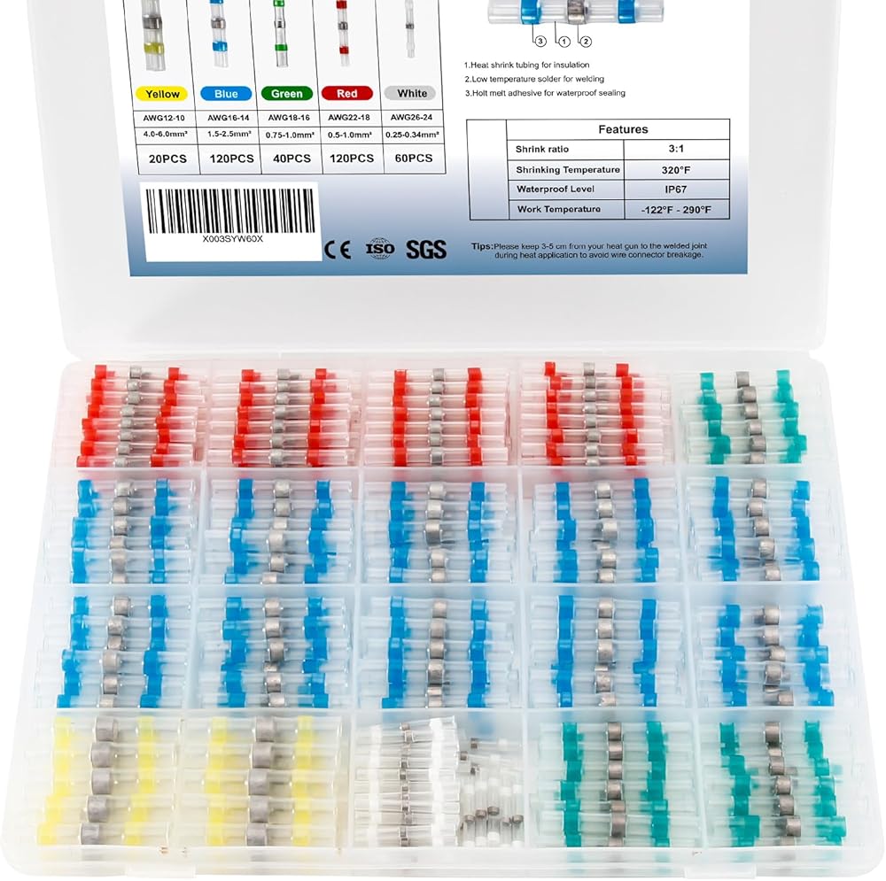 اتصال سلكي بسيط بخطوة واحدة لختم مقاوم للماء، واللحام، والعزل الكهربائي، لأن موصلات سلك ختم اللحام هذه مصنوعة من مادة لاصقة تذوب الساخنة، ولحام بدرجة حرارة منخفضة وأنابيب انكماش حراري؛