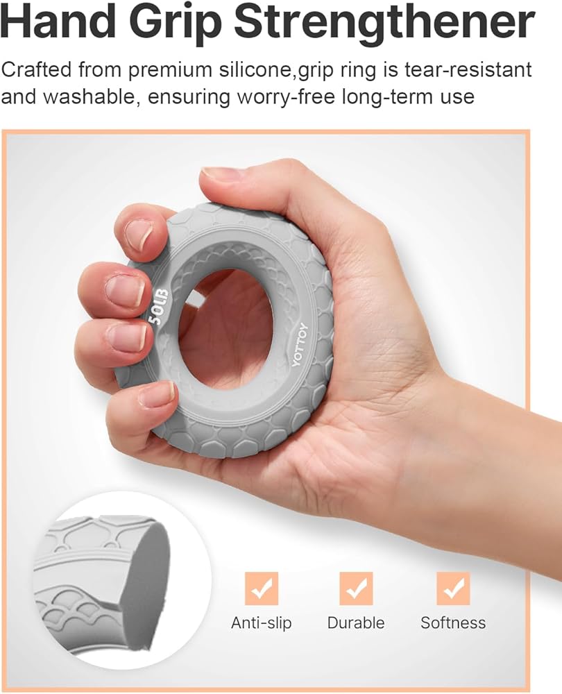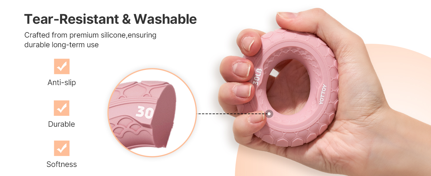 • مادة متينة وآمنة: مصنوعة من السيليكون الفاخر، حلقة المقبض الخاصة بنا مقاومة للتمزق وقابلة للغسل، مما يضمن استخدامًا طويل الأمد بدون قلق. بفضل سطحه المزخرف، فإنه يوفر قبضة آمنة ويمكن استخدامه كتدليك يدوي صغير لمزيد من الراحة وتخفيف التوتر.