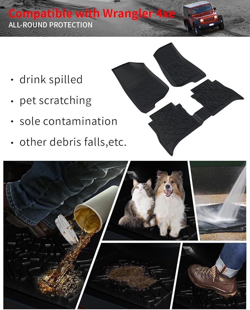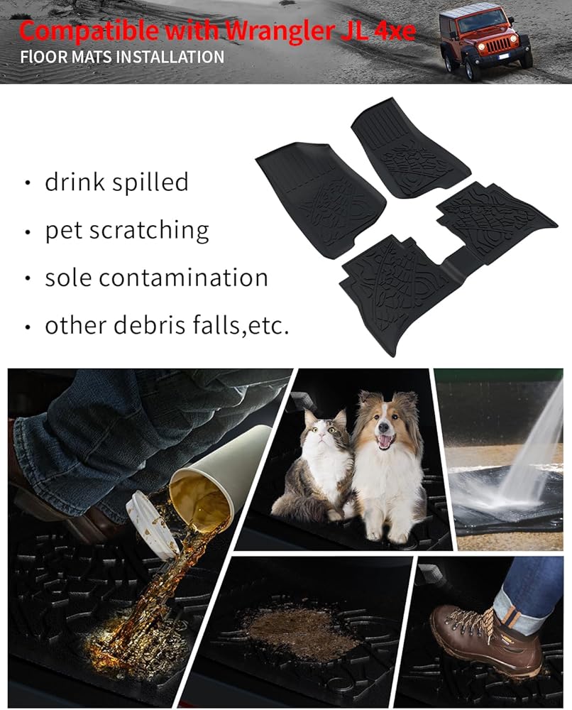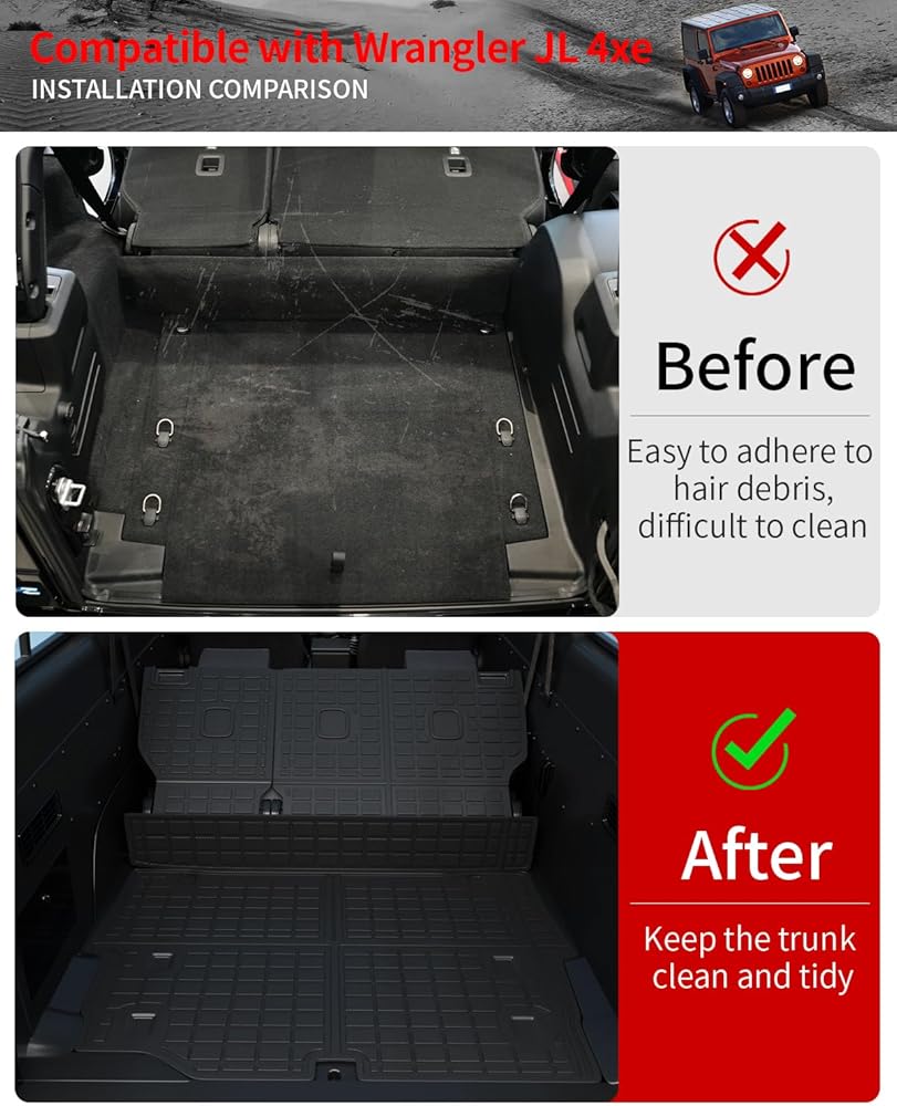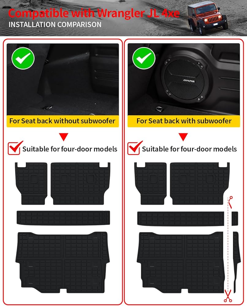 • الإعداد: وفقًا للسيارة الأصلية، تم تصميم سجادة الحمولة وسجادات مسند الظهر وسجادات الأرضية لـ 2018 2019 2020 2021 2022 2023 2024 Jeep Wrangler JL 4 أبواب. غير مناسبة لـ 4XE/Plug-in hybrid/hybrid/JK. يرجى التحقق من نموذج سيارتك بعناية قبل الشراء.