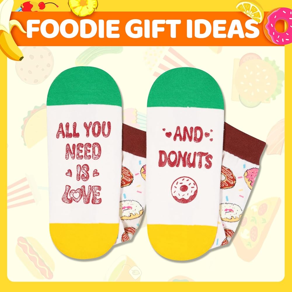 جوارب الدونات: تتميز جوارب الطعام هذه للجنسين بالكعك في الأعلى. يوجد في الأسفل مقولة مضحكة "كل ما تحتاجه هو الحب والدونات".