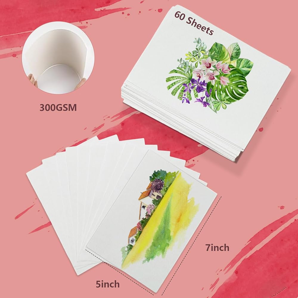 60 ورقة من ورق الألوان المائية، 5 × 7 بوصة من ورق الألوان المائية بالضغط البارد للأطفال والبالغين، ورق رسم صغير بألوان مائية بيضاء اللون لمستلزمات الرسم الفني