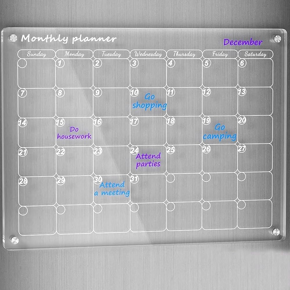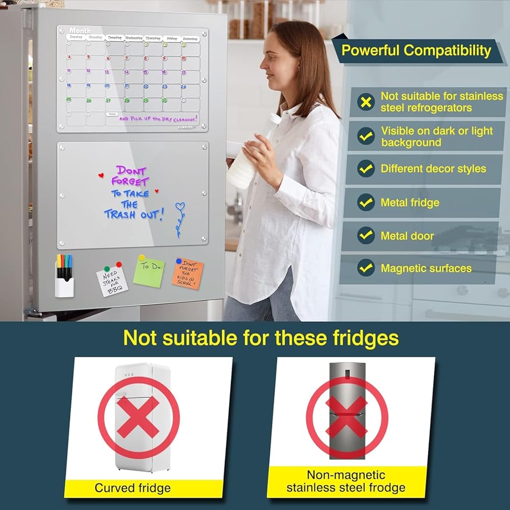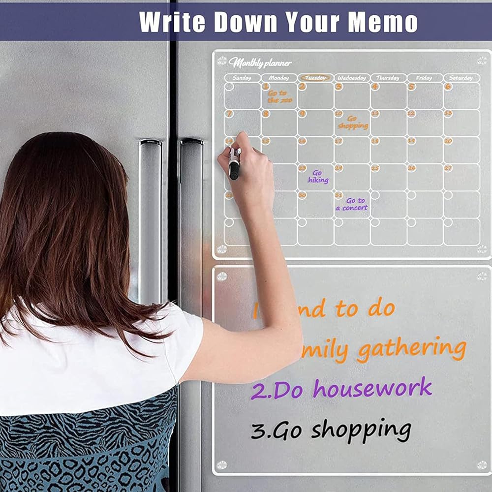 This clear calendar dry erase board has a modern design that will easily fit into your kitchen. Its transparent color will not obscure the appearance of the refrigerator.