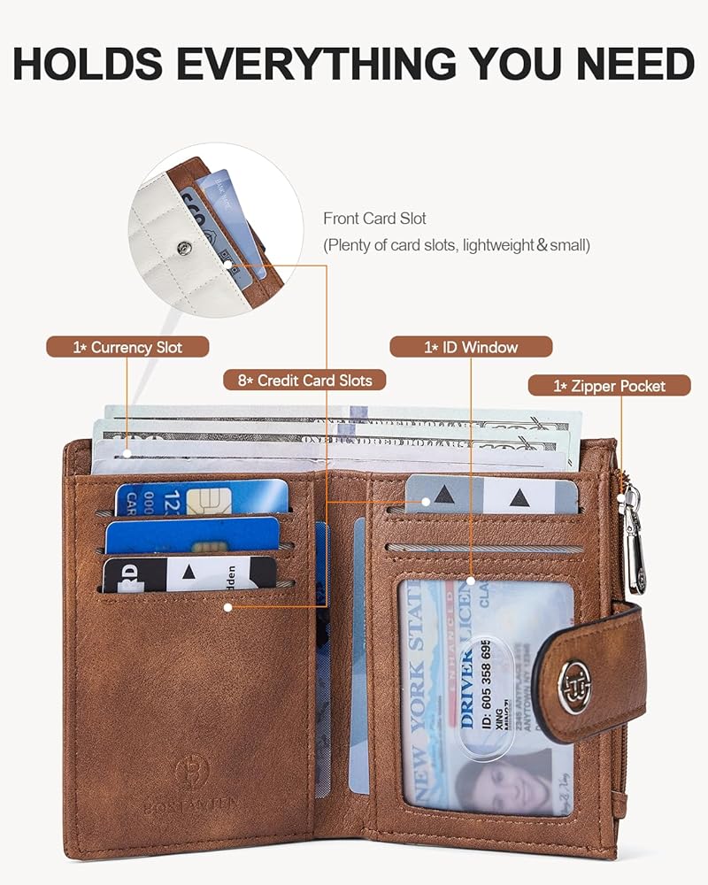 تصميم عملي: محفظة جلدية ثنائية الطي تأتي مع 8 فتحات لبطاقات الائتمان، 1 نافذة لبطاقة الهوية، 1 فتحة للعملات، 1 جيب بسحاب للتغيير. واسعة بما فيه الكفاية لتناسب الكثير من البطاقات، والتغيير وبعض الفواتير والعملات المعدنية، والحفاظ عليها منظمة بشكل جيد. تم اختبار فتحة البطاقة في محفظة السيدات عدة مرات ومن السهل إدخال وإخراج بطاقاتك. تم اختبار سحاب محفظة RFID النسائية عدة مرات ويجب أن يكون سلسًا وغير عالق.