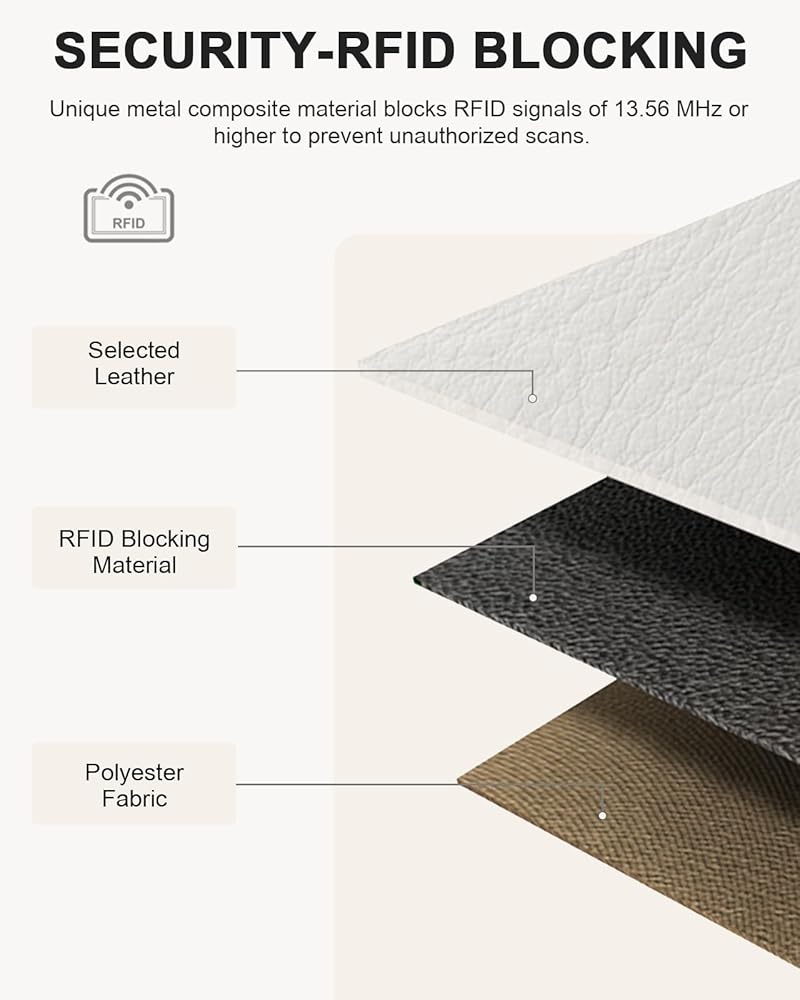 حجب وحماية RFID: تتميز المحفظة الجلدية الصغيرة بمادة حجب خاصة، والتي ستمنع أي إشارات RFID وتحمي معلوماتك الخاصة القيمة من الوصول غير المصرح به عن بعد، مما يحافظ على التفاصيل الشخصية وتفاصيل بطاقة الائتمان الخاصة بك آمنة عند السفر أو عند التسوق.